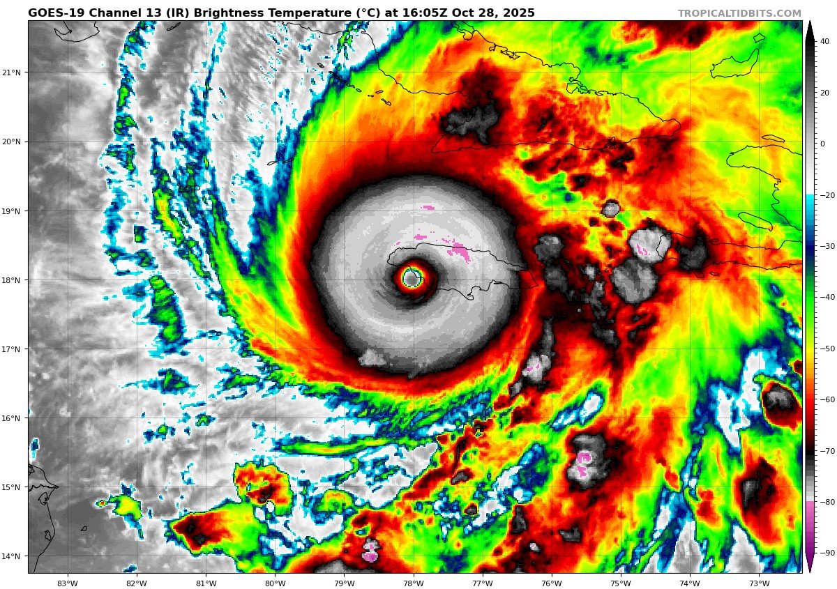Melissa pasará directamente sobre Jamaica durante las próximas horas, trayendo vientos catastróficos, lluvias torrenciales e inundaciones, y una marejada ciclónica que pone en peligro la vida. Su centro se desplaza actualmente hacia el norte-noreste a 14 km/h.