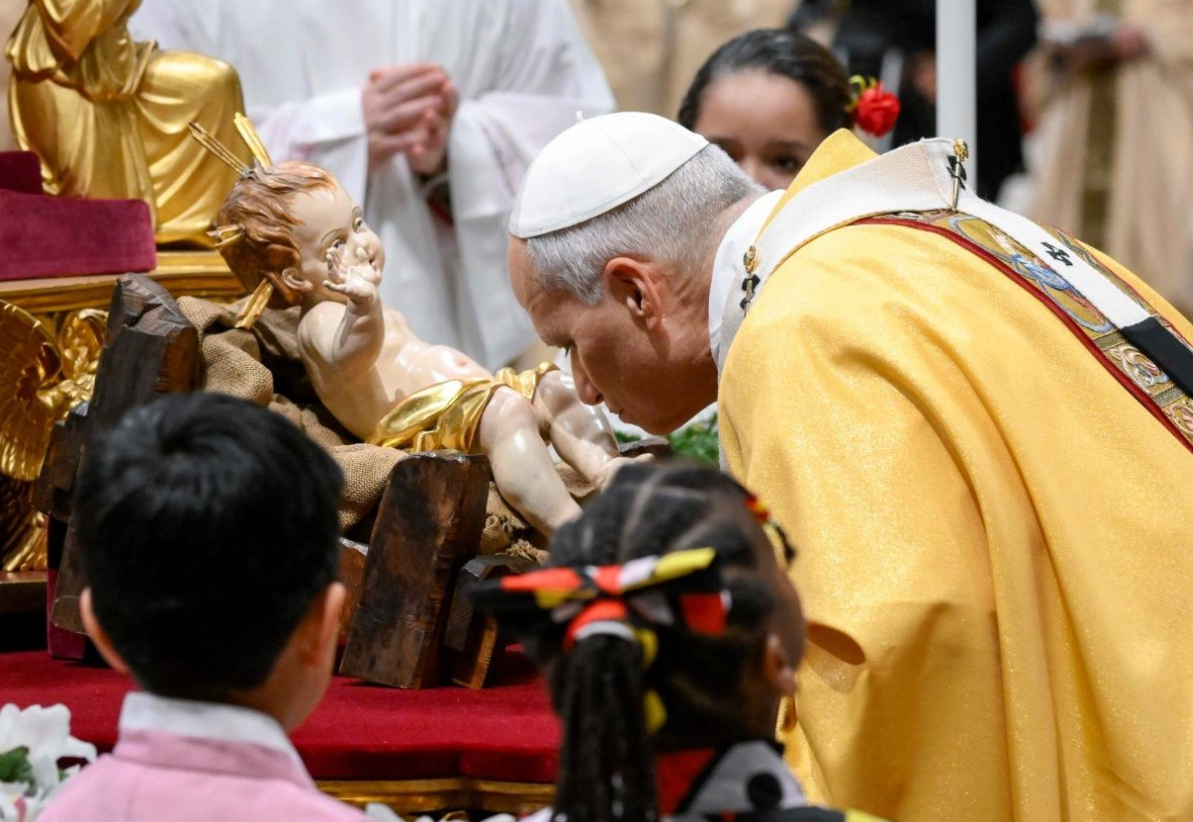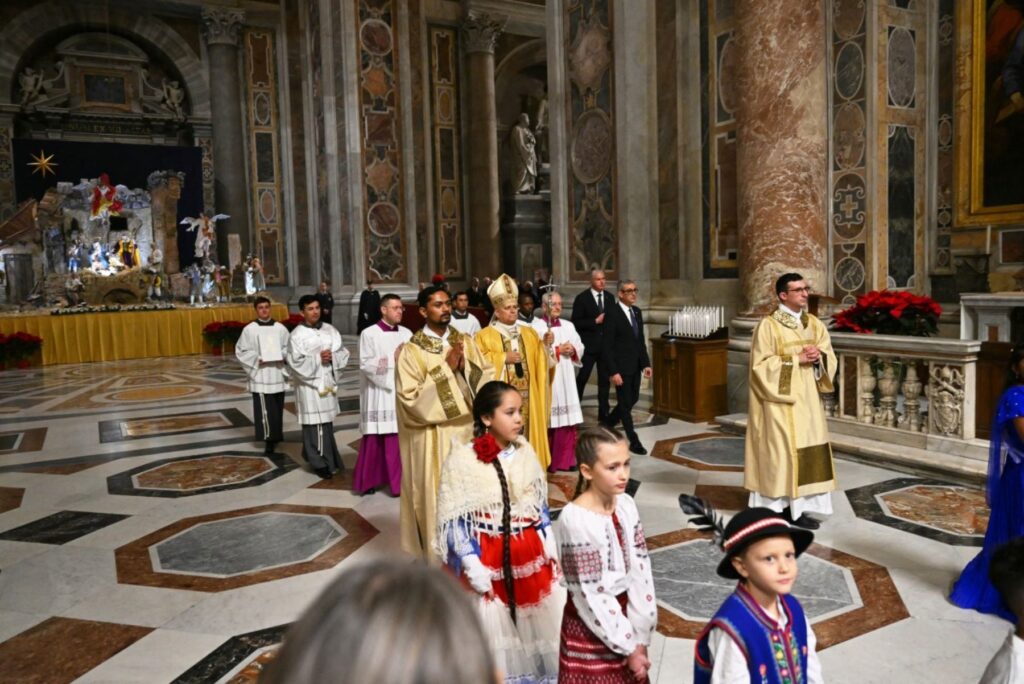Como es tradición, el Papa León XIV descubrió la estatua del Niño Jesús antes del inicio de la Misa de Nochebuena en el Vaticano, mientras niños de Corea del Sur, India, Mozambique, Paraguay, Polonia y Ucrania ofrecían flores al Niño Dios.