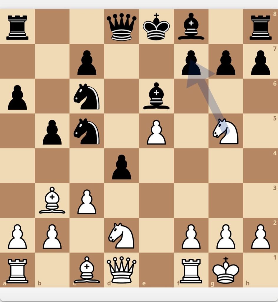 Dxc6 Dxe5 15. b4 para desviar al caballo y tomar en a6).11… Ad5 12 Cxf7 si 12… Axf7 13 Axf7 Rxf7 14 Df3+ ataque doble al rey y al caballo de c6 12. Rxf7 (13. Df3 Re6 14. Dg4 Rf7 15. Df5 Re7 16. e6 Axe6 17. Te1 Dd6 18. Axe6 Cxe6 19. Ce4 De5 20.Ag5+ Rd7 21. Cc5+ Axc5 22. Df7+ Rd6 23. Ae7 desvía al caballo de la defensa de la dama 23… Dd5 abandonan… La partida pudo seguir 24. Df3+ y con 24…De4 25 c4 si 25… Rc4 26 Db3++ y si 25… bxc4 26. De4++.