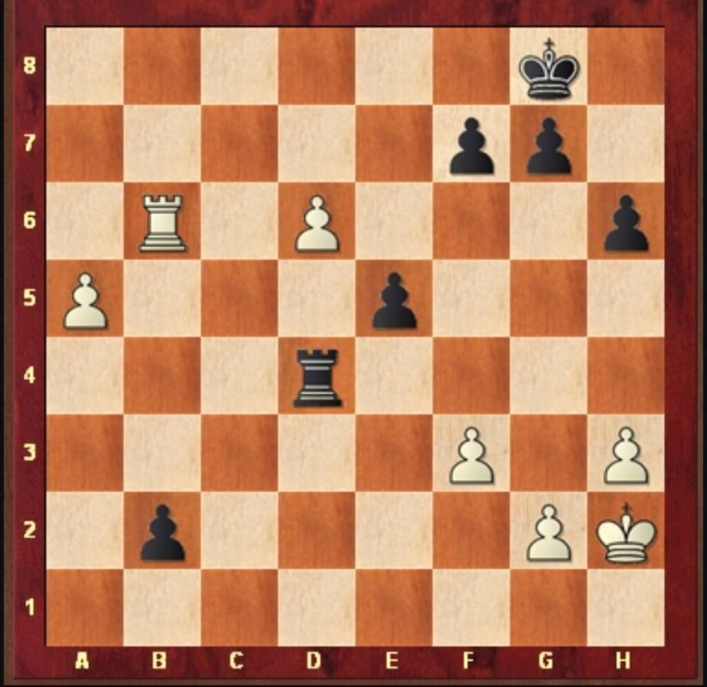 Veamos primeramente la variante calculada por la que, entre los apuros de tiempo, se acordó las tablas: 1 a6, Txd6 2 a7 Txb6, 3 a8=D+, Rh7, De4+, g6 y Db1 para detener el peón y la posición se torna algo incierta.