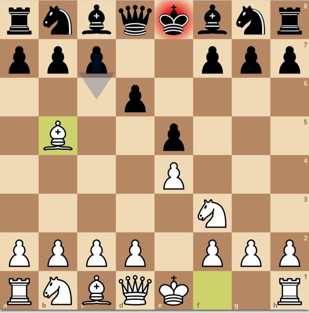 El niño de las negras, llorando, llamó al árbitro: «¡Árbitro, árbitro, se comió a mi rey!». 1 e4 e5 2Cf3 d6 3Ab5 + (jaque) 3…Cf6 (jugada ilegal) 4 Axe8 (captura al rey).