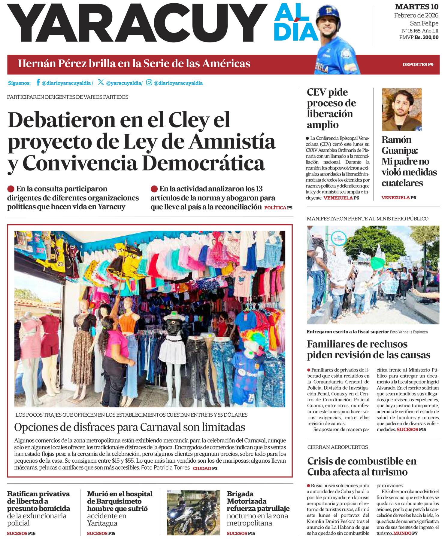 InicioPortadaPortada 10 de febrero Portada Portada 10 de febrero Por Redacción 10 de febrero de 2026 Compartir FacebookTwitterWhatsApp - Publicidad - Compartir FacebookTwitterWhatsApp Artículo anteriorConferencia Episcopal Venezolana demanda una amnistía general, amplia e inclusivaArtículo siguienteDisfraces para Carnaval rondan entre 15 y 55 dólares ARTÍCULOS RELACIONADOS Portada Portada 9 de febrero 9 de febrero de 2026 Portada Portada 6 de febrero 6 de febrero de 2026 Portada Portada 3 de febrero 3 de febrero de 2026 Portada Portada 2 de febrero 2 de febrero de 2026 Portada Portada 30 de enero 30 de enero de 2026 Portada Portada 29 de enero 29 de enero de 2026 Últimas entradas Disfraces para Carnaval rondan entre 15 y 55 dólares 10 de febrero de 2026 Conferencia Episcopal Venezolana demanda una amnistía general, amplia e inclusiva 9 de febrero de 2026 Vente Venezuela: Juan Pablo Guanipa está recluido nuevamente en la PNB de Maripérez en Caracas 9 de febrero de 2026 Delcy Rodríguez anuncia encuesta para definir las bases del nuevo modelo laboral 9 de febrero de 2026 Cargar más lo más leído Mujer detenida en Páez hace 9 días es una de las 25 personas arrestadas por ser promotoras del dólar no oficial 31 de mayo de 2025 ¡PSG gana su primera ‘orejona’ y hace historia! Golea 5-0 al Inter 31 de mayo de 2025 Fiscales que fueron destituidos del MP entregarán escrito ante el Departamento de RR HH en Caracas 7 de julio de 2025 Alias «El Niño» fue detenido en Veroes con droga y un arma de fuego, era investigado por comisión de inteligencia de la PNB 7 de julio de 2025 Cargar más TE PUEDE INTERESAR Conferencia Episcopal Venezolana demanda una amnistía general, amplia e inclusiva 9 de febrero de 2026 Vente Venezuela: Juan Pablo Guanipa está recluido nuevamente en la PNB de Maripérez en Caracas 9 de febrero de 2026 Delcy Rodríguez anuncia encuesta para definir las bases del nuevo modelo laboral 9 de febrero de 2026 Jesús Faría: El tema salarial es la principal prioridad del Gobierno nacional 9 de febrero de 2026 Cargar más