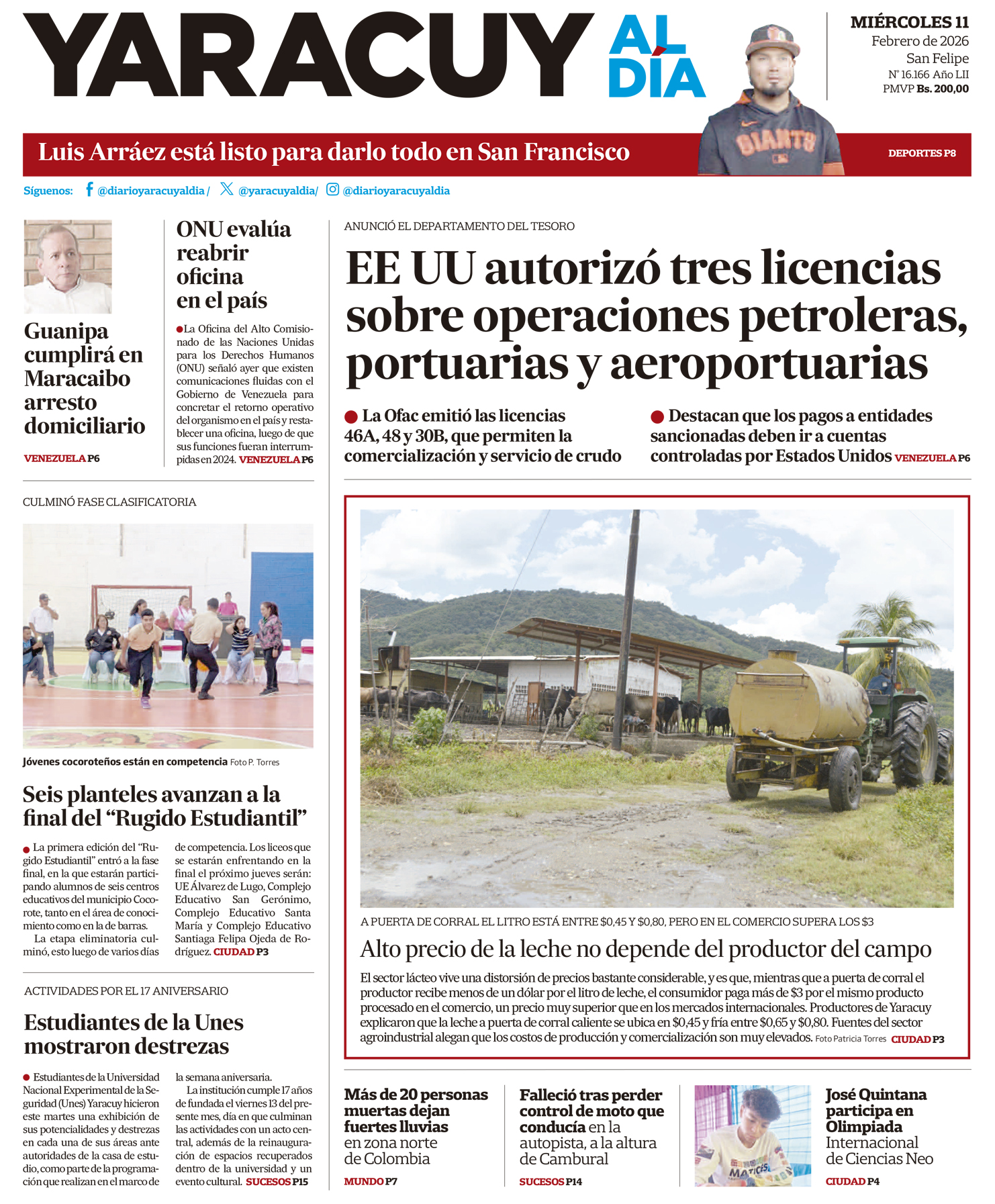 InicioPortadaPortada 11 de febrero Portada Portada 11 de febrero Por Redacción 11 de febrero de 2026 Compartir FacebookTwitterWhatsApp - Publicidad - Compartir FacebookTwitterWhatsApp Artículo anteriorOfac autoriza transacciones con PDVSA para exploración y producción de gas y petróleoArtículo siguienteBrecha del precio del litro de leche entre el campo y comercio supera el 400 % ARTÍCULOS RELACIONADOS Portada Portada 10 de febrero 10 de febrero de 2026 Portada Portada 9 de febrero 9 de febrero de 2026 Portada Portada 6 de febrero 6 de febrero de 2026 Portada Portada 3 de febrero 3 de febrero de 2026 Portada Portada 2 de febrero 2 de febrero de 2026 Portada Portada 30 de enero 30 de enero de 2026 Últimas entradas Brecha del precio del litro de leche entre el campo y comercio supera el 400 % 11 de febrero de 2026 Ofac autoriza transacciones con PDVSA para exploración y producción de gas y petróleo 10 de febrero de 2026 Alto Comisionado de DD HH de la ONU confirma contactos con autoridades venezolanas para reanudar cooperación 10 de febrero de 2026 Colapso de tubo matriz deja un fallecido en los Valles del Tuy +Video 10 de febrero de 2026 Cargar más lo más leído Mujer detenida en Páez hace 9 días es una de las 25 personas arrestadas por ser promotoras del dólar no oficial 31 de mayo de 2025 ¡PSG gana su primera ‘orejona’ y hace historia! Golea 5-0 al Inter 31 de mayo de 2025 Fiscales que fueron destituidos del MP entregarán escrito ante el Departamento de RR HH en Caracas 7 de julio de 2025 Alias «El Niño» fue detenido en Veroes con droga y un arma de fuego, era investigado por comisión de inteligencia de la PNB 7 de julio de 2025 Cargar más TE PUEDE INTERESAR Ofac autoriza transacciones con PDVSA para exploración y producción de gas y petróleo 10 de febrero de 2026 Alto Comisionado de DD HH de la ONU confirma contactos con autoridades venezolanas para reanudar cooperación 10 de febrero de 2026 Colapso de tubo matriz deja un fallecido en los Valles del Tuy +Video 10 de febrero de 2026 Arráez al integrarse a los Gigantes: «Es un nuevo año, una oportunidad para mejorar» 10 de febrero de 2026 Cargar más