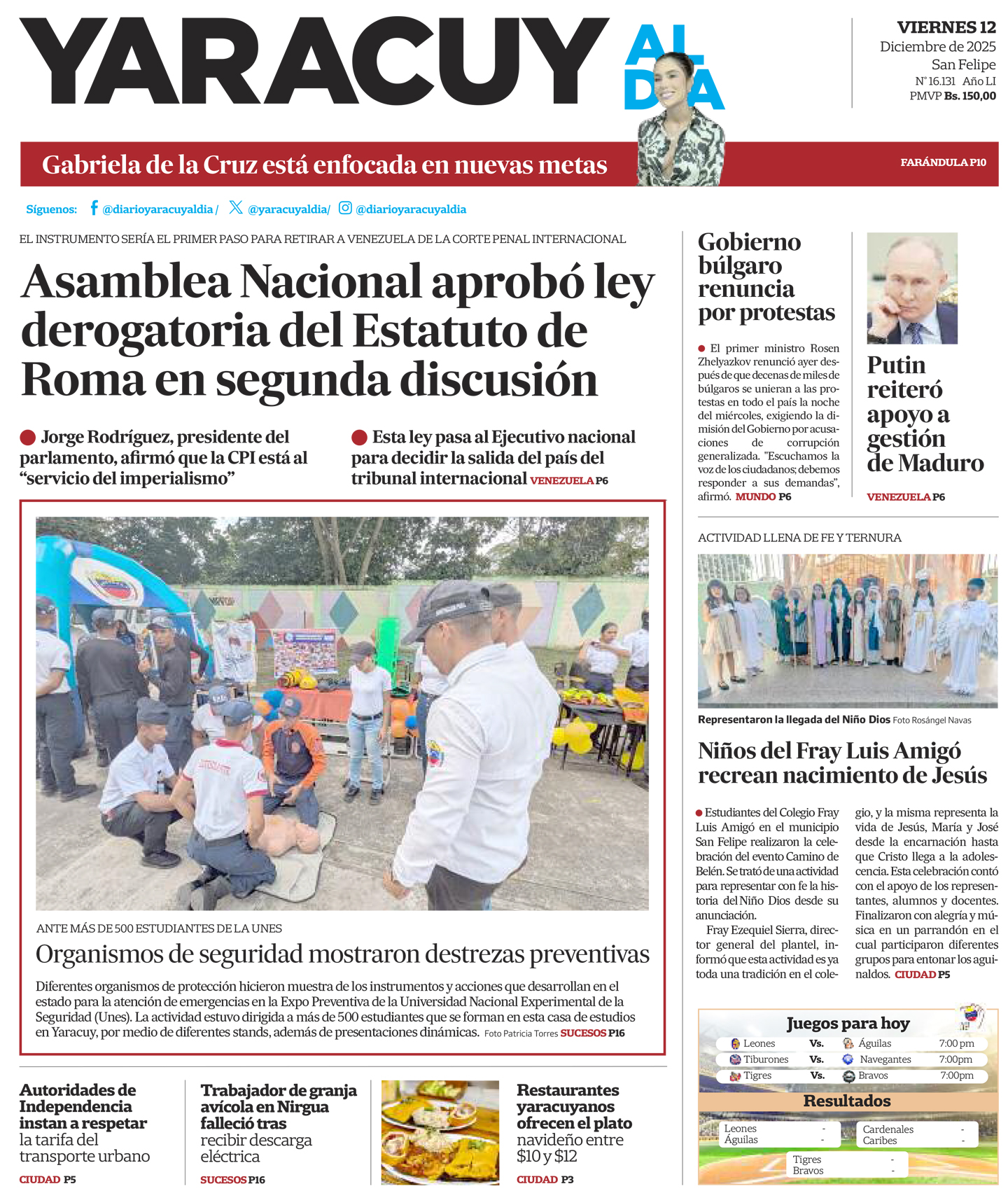 InicioPortadaPortada 12 de diciembre Portada Portada 12 de diciembre Por Redacción 12 de diciembre de 2025 Compartir FacebookTwitterWhatsApp - Publicidad - Compartir FacebookTwitterWhatsApp Artículo anteriorCancillería: Maduro reafirma con Putin el carácter estratégico y sólido de sus relacionesArtículo siguienteAN aprobó ley derogatoria del Estatuto de Roma para abandonar la CPI ARTÍCULOS RELACIONADOS Portada Portada 27 de enero 27 de enero de 2026 Portada Portada 26 de enero 26 de enero de 2026 Portada Portada 23 de enero 23 de enero de 2026 Portada Portada 22 de enero 22 de enero de 2026 Portada Portada 21 de enero 21 de enero de 2026 Portada Portada 20 de enero 20 de enero de 2026 Últimas entradas Familiares visitaron a presos por motivos políticos tras 18 días de vigilia y reclamos 27 de enero de 2026 Delcy Rodríguez: Nos encontramos desbloqueando los activos de Venezuela que están en el exterior 27 de enero de 2026 Nuevo comandante de la Zodi Yaracuy encabezó reunión para articular estrategias de seguridad 27 de enero de 2026 Familiares de 39 detenidos por contexto político solicitan a la Iglesia católica que interceda por liberaciones (Yaracuy) 27 de enero de 2026 Cargar más lo más leído Mujer detenida en Páez hace 9 días es una de las 25 personas arrestadas por ser promotoras del dólar no oficial 31 de mayo de 2025 ¡PSG gana su primera ‘orejona’ y hace historia! Golea 5-0 al Inter 31 de mayo de 2025 Fiscales que fueron destituidos del MP entregarán escrito ante el Departamento de RR HH en Caracas 7 de julio de 2025 Alias «El Niño» fue detenido en Veroes con droga y un arma de fuego, era investigado por comisión de inteligencia de la PNB 7 de julio de 2025 Cargar más TE PUEDE INTERESAR Familiares visitaron a presos por motivos políticos tras 18 días de vigilia y reclamos 27 de enero de 2026 Delcy Rodríguez: Nos encontramos desbloqueando los activos de Venezuela que están en el exterior 27 de enero de 2026 Nuevo comandante de la Zodi Yaracuy encabezó reunión para articular estrategias de seguridad 27 de enero de 2026 Incorporan a cuatro bancos más en el sistema de subasta de divisas 27 de enero de 2026 Cargar más