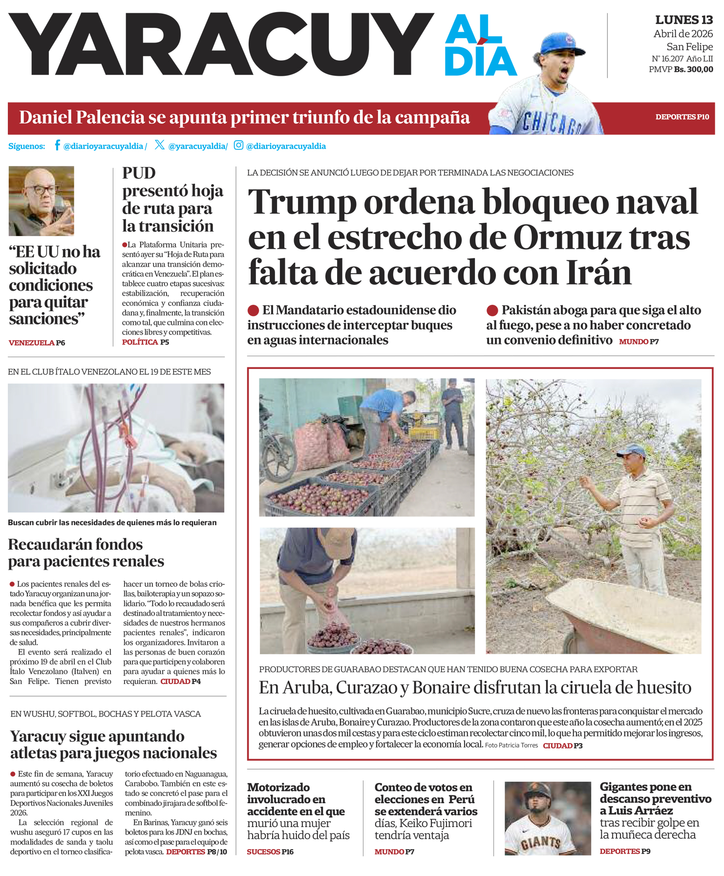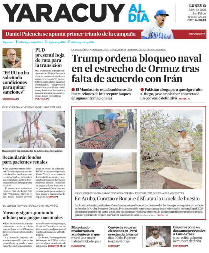 InicioPortadaPortada 13 de abril Portada Portada 13 de abril Por Redacción 13 de abril de 2026 Compartir FacebookTwitterWhatsApp - Publicidad - Compartir FacebookTwitterWhatsApp Artículo anteriorFreddy Superlano: Todos los poderes deben pasar por un proceso de legitimaciónArtículo siguienteCiruela de huesito de Guarabao (Yaracuy) conquista el mercado en Aruba, Bonaire y Curazao ARTÍCULOS RELACIONADOS Portada Portada 10 de abril 10 de abril de 2026 Portada Portada 9 de abril 9 de abril de 2026 Portada Portada 8 de abril 8 de abril de 2026 Portada Portada 7 de abril 7 de abril de 2026 Portada Portada 6 de abril 6 de abril de 2026 Portada Portada 1 de abril 1 de abril de 2026 Últimas entradas Ciruela de huesito de Guarabao (Yaracuy) conquista el mercado en Aruba, Bonaire y Curazao 13 de abril de 2026 Freddy Superlano: Todos los poderes deben pasar por un proceso de legitimación 12 de abril de 2026 Jorge Rodríguez: Estados Unidos no ha fijado condiciones para el levantamiento de sanciones 12 de abril de 2026 Pacientes renales de Yaracuy harán un evento para recolectar fondos en el Club Italven 12 de abril de 2026 Cargar más lo más leído Mujer detenida en Páez hace 9 días es una de las 25 personas arrestadas por ser promotoras del dólar no oficial 31 de mayo de 2025 ¡PSG gana su primera ‘orejona’ y hace historia! Golea 5-0 al Inter 31 de mayo de 2025 Fiscales que fueron destituidos del MP entregarán escrito ante el Departamento de RR HH en Caracas 7 de julio de 2025 Alias «El Niño» fue detenido en Veroes con droga y un arma de fuego, era investigado por comisión de inteligencia de la PNB 7 de julio de 2025 Cargar más TE PUEDE INTERESAR Freddy Superlano: Todos los poderes deben pasar por un proceso de legitimación 12 de abril de 2026 Jorge Rodríguez: Estados Unidos no ha fijado condiciones para el levantamiento de sanciones 12 de abril de 2026 Ajustan tarifas de peajes: desde 180 bolívares hasta 3.470 para carga pesada 12 de abril de 2026 Estados Unidos e Irán cierran negociación sin acuerdo de paz, Trump dijo: «Me da igual» 12 de abril de 2026 Cargar más