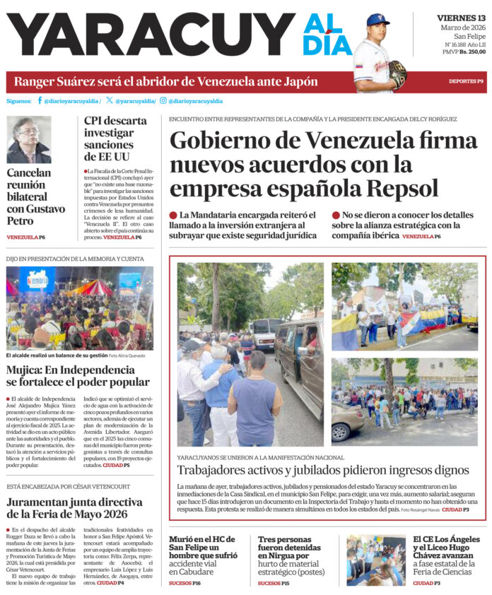 InicioPortadaPortada 13 de marzo Portada Portada 13 de marzo Por Redacción 13 de marzo de 2026 Compartir FacebookTwitterWhatsApp - Publicidad - Compartir FacebookTwitterWhatsApp Artículo anteriorCPI rechaza investigar sanciones de Estados Unidos contra Venezuela por presuntos crímenes de lesa humanidad ARTÍCULOS RELACIONADOS Portada Portada 12 de marzo 12 de marzo de 2026 Portada Portada 11 de marzo 11 de marzo de 2026 Portada Portada 10 de marzo 10 de marzo de 2026 Portada Portada 9 de marzo 9 de marzo de 2026 Portada Portada 6 de marzo 6 de marzo de 2026 Portada Portada 4 de marzo 4 de marzo de 2026 Últimas entradas CPI rechaza investigar sanciones de Estados Unidos contra Venezuela por presuntos crímenes de lesa humanidad 12 de marzo de 2026 Delcy Rodríguez firma nuevos acuerdos con Repsol para potenciar la industria energética venezolana 12 de marzo de 2026 Gestión municipal 2025 en Independencia priorizó los servicios públicos y fortalecimiento de poder popular 12 de marzo de 2026 Falleció en el Hospital Central de San Felipe (Yaracuy) hombre que sufrió accidente en Lara 12 de marzo de 2026 Cargar más lo más leído Mujer detenida en Páez hace 9 días es una de las 25 personas arrestadas por ser promotoras del dólar no oficial 31 de mayo de 2025 ¡PSG gana su primera ‘orejona’ y hace historia! Golea 5-0 al Inter 31 de mayo de 2025 Fiscales que fueron destituidos del MP entregarán escrito ante el Departamento de RR HH en Caracas 7 de julio de 2025 Alias «El Niño» fue detenido en Veroes con droga y un arma de fuego, era investigado por comisión de inteligencia de la PNB 7 de julio de 2025 Cargar más TE PUEDE INTERESAR CPI rechaza investigar sanciones de Estados Unidos contra Venezuela por presuntos crímenes de lesa humanidad 12 de marzo de 2026 Delcy Rodríguez firma nuevos acuerdos con Repsol para potenciar la industria energética venezolana 12 de marzo de 2026 Gestión municipal 2025 en Independencia priorizó los servicios públicos y fortalecimiento de poder popular 12 de marzo de 2026 Mojtaba Jamenei: El estrecho de Ormuz permanecerá cerrado 12 de marzo de 2026 Cargar más
