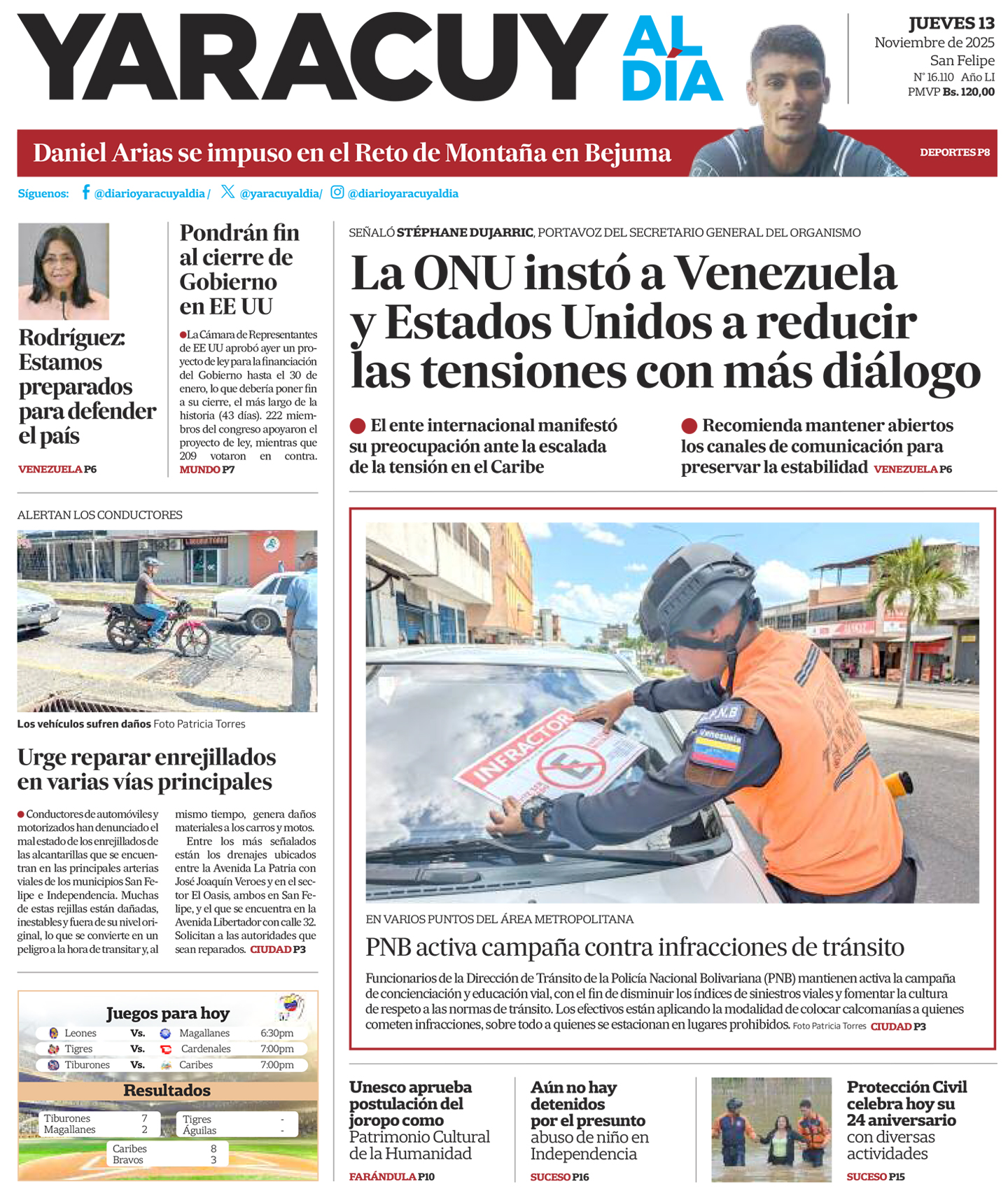 InicioPortadaPortada 13 de noviembre Portada Portada 13 de noviembre Por Redacción 13 de noviembre de 2025 Compartir FacebookTwitterWhatsApp - Publicidad - Compartir FacebookTwitterWhatsApp Artículo anteriorONU urge a Venezuela y Estados Unidos a “desescalar» las tensiones ARTÍCULOS RELACIONADOS Portada Portada 12 de noviembre 12 de noviembre de 2025 Portada Portada 11 de noviembre 11 de noviembre de 2025 Portada Portada 10 de noviembre 10 de noviembre de 2025 Portada Portada 7 de noviembre 7 de noviembre de 2025 Portada Portada 6 de noviembre 6 de noviembre de 2025 Portada Portada 5 de noviembre 5 de noviembre de 2025 Últimas entradas ONU urge a Venezuela y Estados Unidos a “desescalar» las tensiones 12 de noviembre de 2025 Diosdado Cabello pide instalar la mayor cantidad de cámaras en todo el país para la prevención de delitos 12 de noviembre de 2025 Delcy Rodríguez: Estamos preparados para defender a Venezuela 12 de noviembre de 2025 Celebran los 50 años de la Escuela Técnica Agropecuaria Minas de Aroa 12 de noviembre de 2025 Cargar más lo más leído Mujer detenida en Páez hace 9 días es una de las 25 personas arrestadas por ser promotoras del dólar no oficial 31 de mayo de 2025 ¡PSG gana su primera ‘orejona’ y hace historia! Golea 5-0 al Inter 31 de mayo de 2025 Fiscales que fueron destituidos del MP entregarán escrito ante el Departamento de RR HH en Caracas 7 de julio de 2025 Alias «El Niño» fue detenido en Veroes con droga y un arma de fuego, era investigado por comisión de inteligencia de la PNB 7 de julio de 2025 Cargar más TE PUEDE INTERESAR ONU urge a Venezuela y Estados Unidos a “desescalar» las tensiones 12 de noviembre de 2025 Diosdado Cabello pide instalar la mayor cantidad de cámaras en todo el país para la prevención de delitos 12 de noviembre de 2025 Delcy Rodríguez: Estamos preparados para defender a Venezuela 12 de noviembre de 2025 Trump prevé promulgar en las próximas horas la ley que pondrá fin al cierre del Gobierno 12 de noviembre de 2025 Cargar más