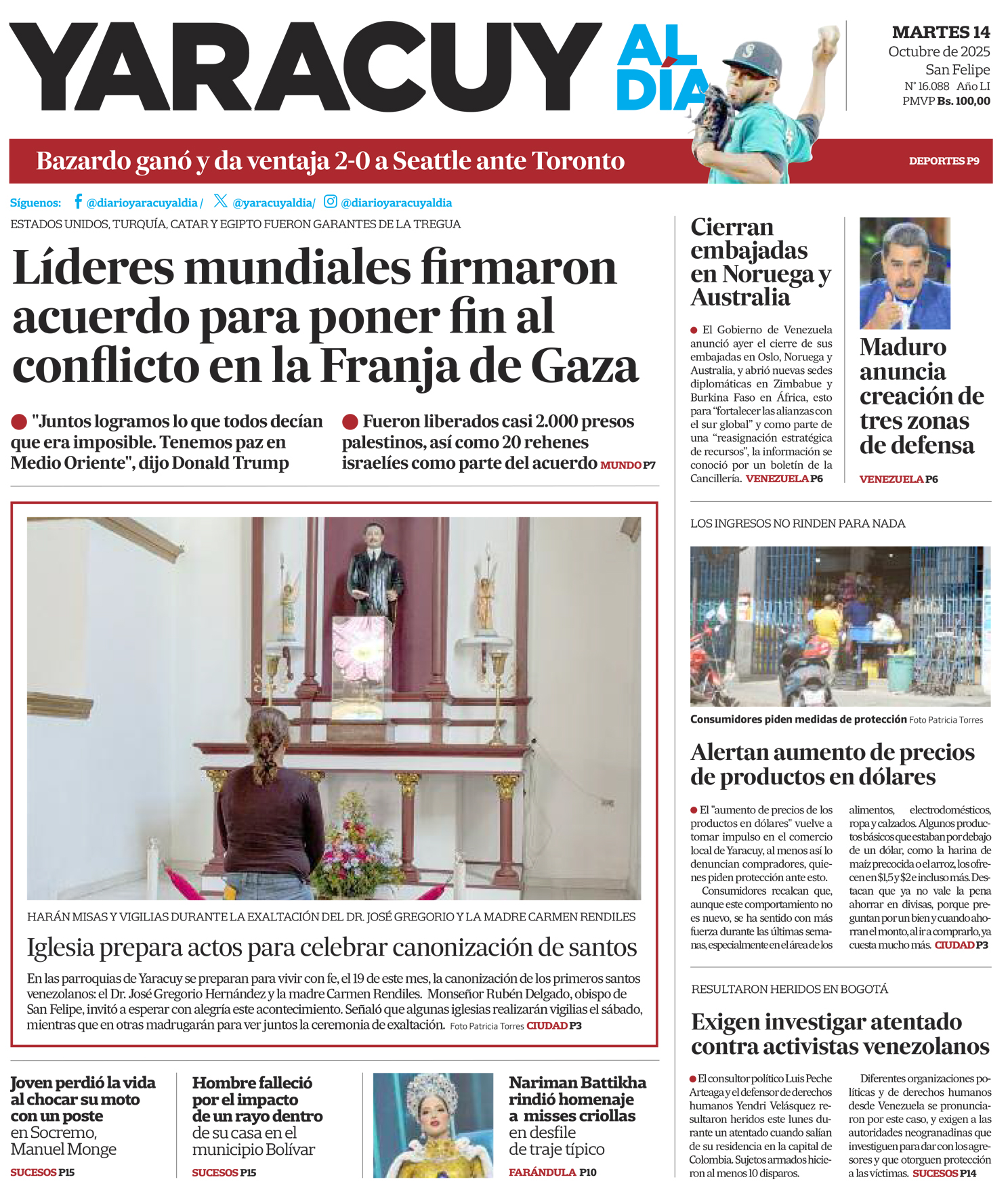 InicioPortadaPortada 14 de octubre Portada Portada 14 de octubre Por Redacción 14 de octubre de 2025 Compartir FacebookTwitterWhatsApp - Publicidad - Compartir FacebookTwitterWhatsApp Artículo anteriorFedecámaras realizará evento para impulsar las exportaciones de productos a ChinaArtículo siguienteCosto de la vida no da respiro al bolsillo: «todo está muy caro» ARTÍCULOS RELACIONADOS Portada Portada 10 de octubre 10 de octubre de 2025 Portada Portada 9 de octubre 9 de octubre de 2025 Portada Portada 8 de octubre 8 de octubre de 2025 Portada Portada 7 de septiembre 7 de octubre de 2025 Portada Portada 6 de octubre 6 de octubre de 2025 Portada Portada 3 de octubre 3 de octubre de 2025 Últimas entradas Producción petrolera en Venezuela llega a 1.105.000 barriles por día 14 de octubre de 2025 Costo de la vida no da respiro al bolsillo: «todo está muy caro» 14 de octubre de 2025 Fedecámaras realizará evento para impulsar las exportaciones de productos a China 13 de octubre de 2025 Maduro anuncia la activación de tres Zodi para el resguardo de los mares del Atlántico y el Caribe 13 de octubre de 2025 Cargar más lo más leído Mujer detenida en Páez hace 9 días es una de las 25 personas arrestadas por ser promotoras del dólar no oficial 31 de mayo de 2025 ¡PSG gana su primera ‘orejona’ y hace historia! Golea 5-0 al Inter 31 de mayo de 2025 Fiscales que fueron destituidos del MP entregarán escrito ante el Departamento de RR HH en Caracas 7 de julio de 2025 Alias «El Niño» fue detenido en Veroes con droga y un arma de fuego, era investigado por comisión de inteligencia de la PNB 7 de julio de 2025 Cargar más TE PUEDE INTERESAR Producción petrolera en Venezuela llega a 1.105.000 barriles por día 14 de octubre de 2025 Fedecámaras realizará evento para impulsar las exportaciones de productos a China 13 de octubre de 2025 Maduro anuncia la activación de tres Zodi para el resguardo de los mares del Atlántico y el Caribe 13 de octubre de 2025 Gustavo Petro plantea posibilidad de reiniciar proceso de paz en Colombia 13 de octubre de 2025 Cargar más