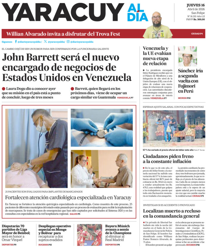InicioPortadaPortada 16 de abril Portada Portada 16 de abril Por Redacción 16 de abril de 2026 Compartir FacebookTwitterWhatsApp - Publicidad - Compartir FacebookTwitterWhatsApp Artículo anteriorFedeagro exige el mismo nivel de seguridad jurídica otorgado al sector petrolero ARTÍCULOS RELACIONADOS Portada Portada 15 de abril 15 de abril de 2026 Portada Portada 14 de abril 14 de abril de 2026 Portada Portada 13 de abril 13 de abril de 2026 Portada Portada 10 de abril 10 de abril de 2026 Portada Portada 9 de abril 9 de abril de 2026 Portada Portada 8 de abril 8 de abril de 2026 Últimas entradas Fedeagro exige el mismo nivel de seguridad jurídica otorgado al sector petrolero 15 de abril de 2026 Estado Unidos designa a John Barrett como encargado de negocios en Venezuela en sustitución de Laura Dogu 15 de abril de 2026 Delcy Rodríguez inicia nueva etapa de relaciones con la Unión Europea durante reunión con una delegación 15 de abril de 2026 Intensifican cerco policial en los municipios Bolívar y Monge para recapturar a los evadidos (Yaracuy) 15 de abril de 2026 Cargar más lo más leído Mujer detenida en Páez hace 9 días es una de las 25 personas arrestadas por ser promotoras del dólar no oficial 31 de mayo de 2025 ¡PSG gana su primera ‘orejona’ y hace historia! Golea 5-0 al Inter 31 de mayo de 2025 Fiscales que fueron destituidos del MP entregarán escrito ante el Departamento de RR HH en Caracas 7 de julio de 2025 Alias «El Niño» fue detenido en Veroes con droga y un arma de fuego, era investigado por comisión de inteligencia de la PNB 7 de julio de 2025 Cargar más TE PUEDE INTERESAR Fedeagro exige el mismo nivel de seguridad jurídica otorgado al sector petrolero 15 de abril de 2026 Estado Unidos designa a John Barrett como encargado de negocios en Venezuela en sustitución de Laura Dogu 15 de abril de 2026 Delcy Rodríguez inicia nueva etapa de relaciones con la Unión Europea durante reunión con una delegación 15 de abril de 2026 Realidades imposibles: verdades que desafían la lógica humana 15 de abril de 2026 Cargar más