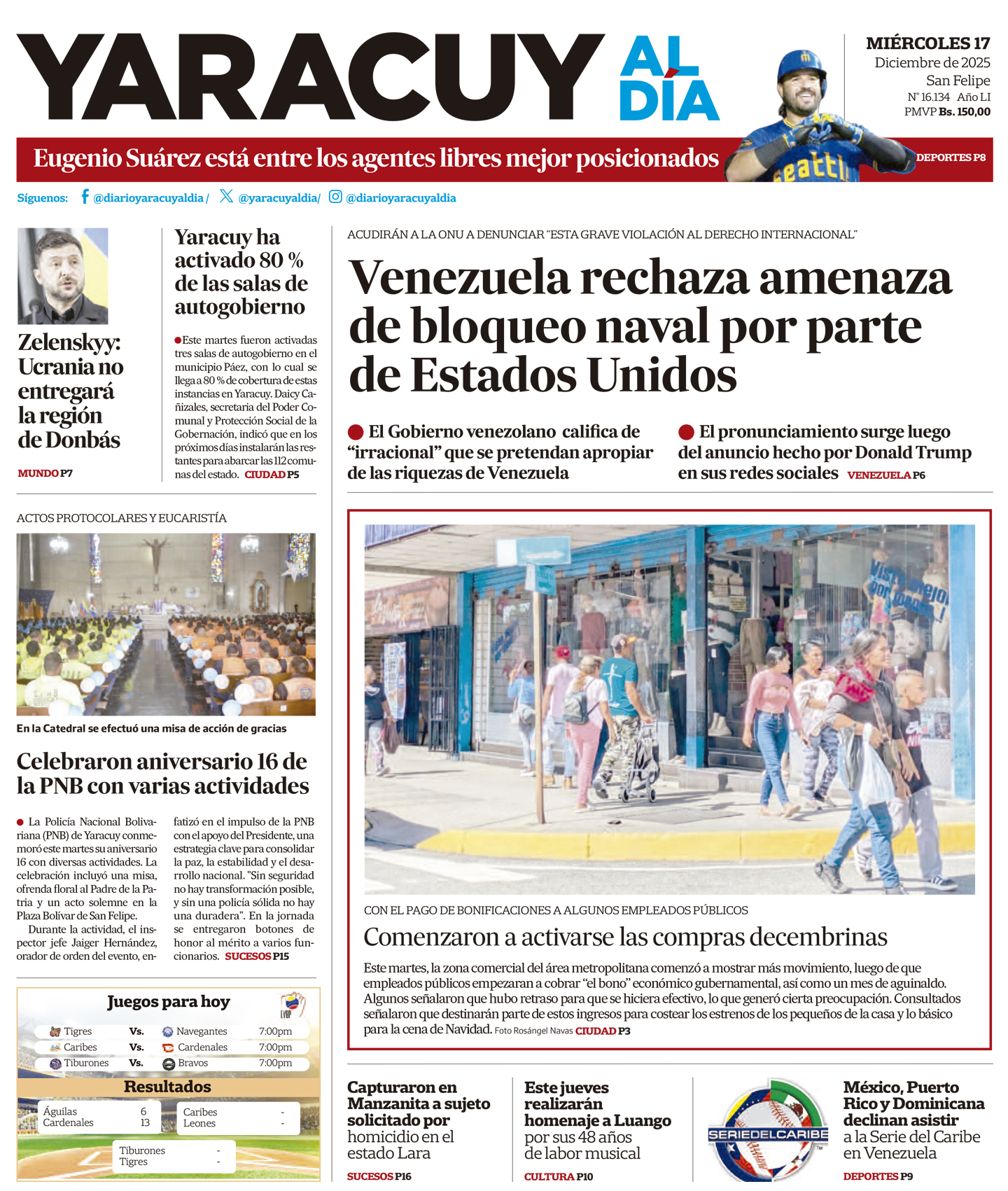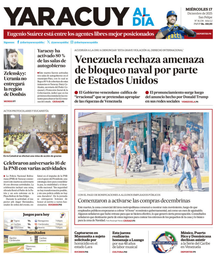 InicioPortadaPortada 17 de diciembre Portada Portada 17 de diciembre Por Redacción 17 de diciembre de 2025 Compartir FacebookTwitterWhatsApp - Publicidad - Compartir FacebookTwitterWhatsApp Artículo anteriorTrinidad y Tobago califica de propaganda falsa anuncio de Venezuela sobre anulación de contratos de gas naturalArtículo siguienteEE UU reafirma advertencia a aerolíneas sobre seguridad al sobrevolar Venezuela ARTÍCULOS RELACIONADOS Portada Portada 16 de diciembre 16 de diciembre de 2025 Portada Portada 15 de diciembre 15 de diciembre de 2025 Portada Portada 12 de diciembre 12 de diciembre de 2025 Portada Portada 11 de diciembre 11 de diciembre de 2025 Portada Portada 10 de diciembre 10 de diciembre de 2025 Portada Portada 9 de diciembre 9 de diciembre de 2025 Últimas entradas Venezuela denuncia amenazas de Trump que pretenden imponer bloqueo militar naval 17 de diciembre de 2025 Fedenaga espera incremento de productividad en 2026 ante los bajos niveles que obtuvieron este año 17 de diciembre de 2025 Siete yaracuyanos participan en el concurso internacional de caricaturas en Rusia 17 de diciembre de 2025 EE UU reafirma advertencia a aerolíneas sobre seguridad al sobrevolar Venezuela 17 de diciembre de 2025 Cargar más lo más leído Mujer detenida en Páez hace 9 días es una de las 25 personas arrestadas por ser promotoras del dólar no oficial 31 de mayo de 2025 ¡PSG gana su primera ‘orejona’ y hace historia! Golea 5-0 al Inter 31 de mayo de 2025 Fiscales que fueron destituidos del MP entregarán escrito ante el Departamento de RR HH en Caracas 7 de julio de 2025 Alias «El Niño» fue detenido en Veroes con droga y un arma de fuego, era investigado por comisión de inteligencia de la PNB 7 de julio de 2025 Cargar más TE PUEDE INTERESAR Venezuela denuncia amenazas de Trump que pretenden imponer bloqueo militar naval 17 de diciembre de 2025 Fedenaga espera incremento de productividad en 2026 ante los bajos niveles que obtuvieron este año 17 de diciembre de 2025 EE UU reafirma advertencia a aerolíneas sobre seguridad al sobrevolar Venezuela 17 de diciembre de 2025 Trinidad y Tobago califica de propaganda falsa anuncio de Venezuela sobre anulación de contratos de gas natural 16 de diciembre de 2025 Cargar más