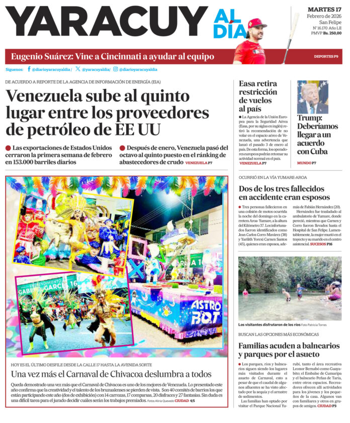 InicioPortadaPortada 17 de febrero Portada Portada 17 de febrero Por Redacción 17 de febrero de 2026 Compartir FacebookTwitterWhatsApp - Publicidad - Compartir FacebookTwitterWhatsApp Artículo anteriorGobierno designa a Luis Motta Domínguez viceministro de Seguimiento de la Gestión de GobiernoArtículo siguienteParques, ríos y balnearios son los puntos que han escogido los temporadistas para disfrutar del Carnaval en Yaracuy ARTÍCULOS RELACIONADOS Portada Portada 16 de febrero 16 de febrero de 2026 Portada Portada 12 de febrero 12 de febrero de 2026 Portada Portada 11 de febrero 11 de febrero de 2026 Portada Portada 10 de febrero 10 de febrero de 2026 Portada Portada 9 de febrero 9 de febrero de 2026 Portada Portada 6 de febrero 6 de febrero de 2026 Últimas entradas Parques, ríos y balnearios son los puntos que han escogido los temporadistas para disfrutar del Carnaval en Yaracuy 17 de febrero de 2026 Gobierno designa a Luis Motta Domínguez viceministro de Seguimiento de la Gestión de Gobierno 16 de febrero de 2026 Agencia de la Unión Europea para la Seguridad Aérea retira recomendación de evitar volar a Venezuela 16 de febrero de 2026 Feligresía en Manuel Monge vivirá con mucha fe el primer retiro de Emaús 16 de febrero de 2026 Cargar más lo más leído Mujer detenida en Páez hace 9 días es una de las 25 personas arrestadas por ser promotoras del dólar no oficial 31 de mayo de 2025 ¡PSG gana su primera ‘orejona’ y hace historia! Golea 5-0 al Inter 31 de mayo de 2025 Fiscales que fueron destituidos del MP entregarán escrito ante el Departamento de RR HH en Caracas 7 de julio de 2025 Alias «El Niño» fue detenido en Veroes con droga y un arma de fuego, era investigado por comisión de inteligencia de la PNB 7 de julio de 2025 Cargar más TE PUEDE INTERESAR Gobierno designa a Luis Motta Domínguez viceministro de Seguimiento de la Gestión de Gobierno 16 de febrero de 2026 Agencia de la Unión Europea para la Seguridad Aérea retira recomendación de evitar volar a Venezuela 16 de febrero de 2026 Portal Banca y Negocios: Venezuela fue el quinto proveedor de petróleo de EE UU en la primera semana de febrero 16 de febrero de 2026 Gobierno argentino hará cambios en reforma laboral tras críticas en el régimen de licencias médicas 16 de febrero de 2026 Cargar más