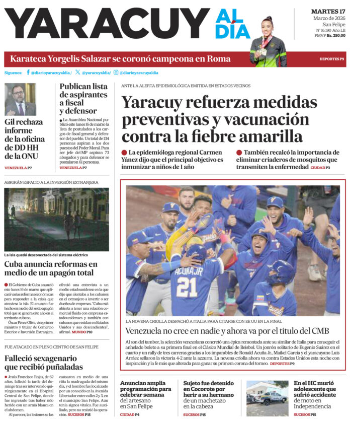 InicioPortadaPortada 17 de marzo Portada Portada 17 de marzo Por Redacción 17 de marzo de 2026 Compartir FacebookTwitterWhatsApp - Publicidad - Compartir FacebookTwitterWhatsApp Artículo anteriorVenezuela remonta ante Italia y avanza a su primera final en el CMB, el próximo objetivo es EE UUArtículo siguienteINTT activa operativos de trámites en nueve estados del país, en Yaracuy será el próximo 20 ARTÍCULOS RELACIONADOS Portada Portada 16 de marzo 16 de marzo de 2026 Portada Portada 13 de marzo 13 de marzo de 2026 Portada Portada 12 de marzo 12 de marzo de 2026 Portada Portada 11 de marzo 11 de marzo de 2026 Portada Portada 10 de marzo 10 de marzo de 2026 Portada Portada 9 de marzo 9 de marzo de 2026 Últimas entradas Gobernador realiza toma recreativa en una remozada Plaza Las Banderas en apoyo a Venezuela en el Clásico Mundial de Béisbol 17 de marzo de 2026 INTT activa operativos de trámites en nueve estados del país, en Yaracuy será el próximo 20 17 de marzo de 2026 Venezuela remonta ante Italia y avanza a su primera final en el CMB, el próximo objetivo es EE UU 17 de marzo de 2026 73 personas aspiran al cargo de fiscal general y 61 al de defensor del pueblo, la AN publicó la lista 16 de marzo de 2026 Cargar más lo más leído Mujer detenida en Páez hace 9 días es una de las 25 personas arrestadas por ser promotoras del dólar no oficial 31 de mayo de 2025 ¡PSG gana su primera ‘orejona’ y hace historia! Golea 5-0 al Inter 31 de mayo de 2025 Fiscales que fueron destituidos del MP entregarán escrito ante el Departamento de RR HH en Caracas 7 de julio de 2025 Alias «El Niño» fue detenido en Veroes con droga y un arma de fuego, era investigado por comisión de inteligencia de la PNB 7 de julio de 2025 Cargar más TE PUEDE INTERESAR Gobernador realiza toma recreativa en una remozada Plaza Las Banderas en apoyo a Venezuela en el Clásico Mundial de Béisbol 17 de marzo de 2026 INTT activa operativos de trámites en nueve estados del país, en Yaracuy será el próximo 20 17 de marzo de 2026 Venezuela remonta ante Italia y avanza a su primera final en el CMB, el próximo objetivo es EE UU 17 de marzo de 2026 73 personas aspiran al cargo de fiscal general y 61 al de defensor del pueblo, la AN publicó la lista 16 de marzo de 2026 Cargar más