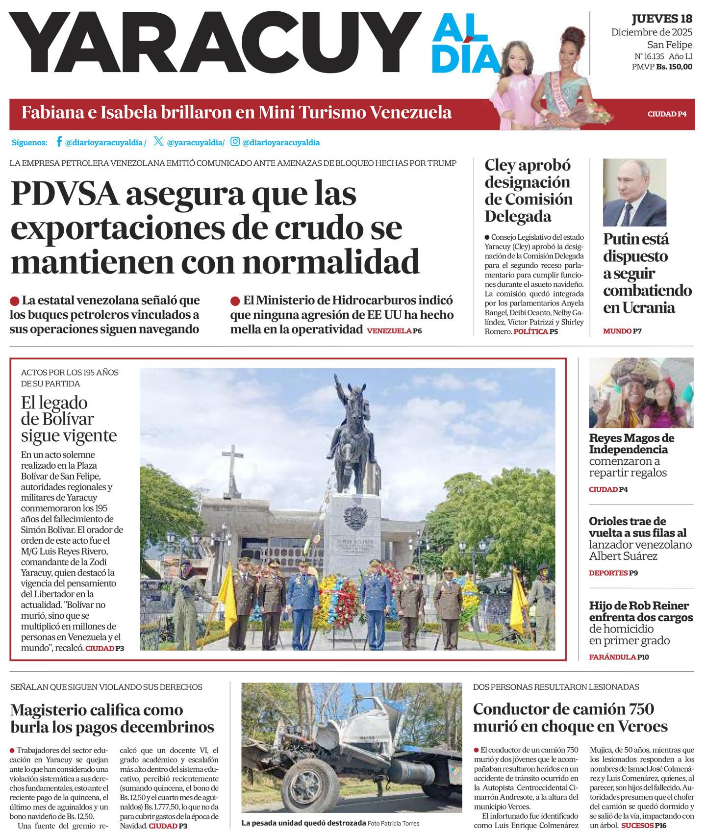 InicioPortadaPortada 18 de diciembre Portada Portada 18 de diciembre Por Yecenia Medina 18 de diciembre de 2025 Compartir FacebookTwitterWhatsApp - Publicidad - Compartir FacebookTwitterWhatsApp Artículo anteriorLa Asamblea Nacional aprobó acuerdo en repudio a las amenazas de Estados UnidosArtículo siguienteEntre Guadalajara, Jalisco o Ciudad de Panamá pudieran estar la sede de la Serie del Caribe ARTÍCULOS RELACIONADOS Portada Portada 17 de diciembre 17 de diciembre de 2025 Portada Portada 16 de diciembre 16 de diciembre de 2025 Portada Portada 15 de diciembre 15 de diciembre de 2025 Portada Portada 12 de diciembre 12 de diciembre de 2025 Portada Portada 11 de diciembre 11 de diciembre de 2025 Portada Portada 10 de diciembre 10 de diciembre de 2025 Últimas entradas Padrino López tacha de arrogantes órdenes del presidente Donald Trump 18 de diciembre de 2025 Entre Guadalajara, Jalisco o Ciudad de Panamá pudieran estar la sede de la Serie del Caribe 18 de diciembre de 2025 La Asamblea Nacional aprobó acuerdo en repudio a las amenazas de Estados Unidos 17 de diciembre de 2025 Maduro pide a secretario general de la ONU durante llamada telefónica rechazar las amenazas de EE UU 17 de diciembre de 2025 Cargar más lo más leído Mujer detenida en Páez hace 9 días es una de las 25 personas arrestadas por ser promotoras del dólar no oficial 31 de mayo de 2025 ¡PSG gana su primera ‘orejona’ y hace historia! Golea 5-0 al Inter 31 de mayo de 2025 Fiscales que fueron destituidos del MP entregarán escrito ante el Departamento de RR HH en Caracas 7 de julio de 2025 Alias «El Niño» fue detenido en Veroes con droga y un arma de fuego, era investigado por comisión de inteligencia de la PNB 7 de julio de 2025 Cargar más TE PUEDE INTERESAR Arráez calificó de positiva la temporada, pero con sabor amargo al final 5 de octubre de 2025 Luis Arráez se coronó como rey del hit en la Liga Nacional 29 de septiembre de 2025 ¿Cómo se miden los sismos? 25 de septiembre de 2025 Portada 19 de septiembre 19 de septiembre de 2025 Cargar más