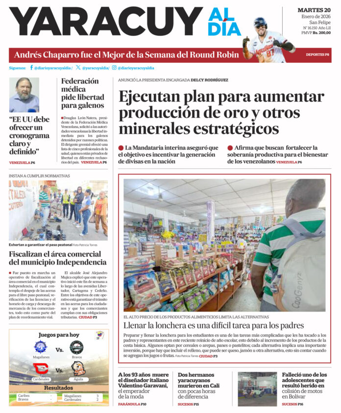 InicioPortadaPortada 20 de enero Portada Portada 20 de enero Por Redacción 20 de enero de 2026 Compartir FacebookTwitterWhatsApp - Publicidad - Compartir FacebookTwitterWhatsApp Artículo anteriorNiña cayó y se hirió en el cuello con un machete que estaba en el piso: está fuera de peligro ARTÍCULOS RELACIONADOS Portada Portada 19 de enero 19 de enero de 2026 Portada Portada 16 de enero 16 de enero de 2026 Portada Portada 13 de enero 13 de enero de 2026 Portada Portada 12 de enero 12 de enero de 2026 Portada Portada 9 de enero 9 de enero de 2026 Portada Portada 8 de enero 8 de enero de 2026 Últimas entradas Niña cayó y se hirió en el cuello con un machete que estaba en el piso: está fuera de peligro 19 de enero de 2026 Gas Yaracuy despliega Plan ‘Asegura tu servicio’ en los 14 municipios de Yaracuy 19 de enero de 2026 Gobierno proyecta aumento del 30 % en la producción de oro para generar divisas 19 de enero de 2026 235 migrantes llegaron al país tras ser deportados desde EE UU, es el segundo vuelo de este año 19 de enero de 2026 Cargar más lo más leído Mujer detenida en Páez hace 9 días es una de las 25 personas arrestadas por ser promotoras del dólar no oficial 31 de mayo de 2025 ¡PSG gana su primera ‘orejona’ y hace historia! Golea 5-0 al Inter 31 de mayo de 2025 Fiscales que fueron destituidos del MP entregarán escrito ante el Departamento de RR HH en Caracas 7 de julio de 2025 Alias «El Niño» fue detenido en Veroes con droga y un arma de fuego, era investigado por comisión de inteligencia de la PNB 7 de julio de 2025 Cargar más TE PUEDE INTERESAR Gas Yaracuy despliega Plan ‘Asegura tu servicio’ en los 14 municipios de Yaracuy 19 de enero de 2026 Gobierno proyecta aumento del 30 % en la producción de oro para generar divisas 19 de enero de 2026 235 migrantes llegaron al país tras ser deportados desde EE UU, es el segundo vuelo de este año 19 de enero de 2026 Policía de Yaracuy activa plan para elevar capacidad táctica de respuesta a la ciudadanía 19 de enero de 2026 Cargar más
