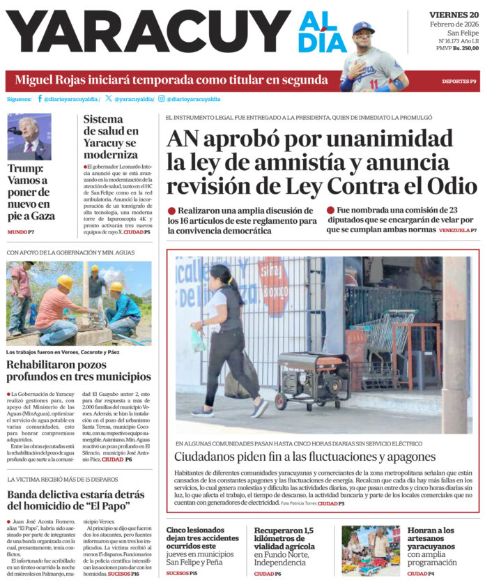 InicioPortadaPortada 20 de febrero Portada Portada 20 de febrero Por Redacción 20 de febrero de 2026 Compartir FacebookTwitterWhatsApp - Publicidad - Compartir FacebookTwitterWhatsApp Artículo anteriorDelcy Rodríguez: Visitas internacionales al país prometen inversiones en motores productivosArtículo siguienteMúsicos toman las plazas y calles de Yaracuy con el programa «Suena ciudad» ARTÍCULOS RELACIONADOS Portada Portada 18 de febrero 18 de febrero de 2026 Portada Portada 17 de febrero 17 de febrero de 2026 Portada Portada 16 de febrero 16 de febrero de 2026 Portada Portada 12 de febrero 12 de febrero de 2026 Portada Portada 11 de febrero 11 de febrero de 2026 Portada Portada 10 de febrero 10 de febrero de 2026 Últimas entradas Repsol operará nuevamente en Venezuela, espera aumentar 50 % la producción en los próximos 12 meses 20 de febrero de 2026 Músicos toman las plazas y calles de Yaracuy con el programa «Suena ciudad» 20 de febrero de 2026 Delcy Rodríguez: Visitas internacionales al país prometen inversiones en motores productivos 19 de febrero de 2026 La Asamblea Nacional aprobó la Ley de Amnistía para la Convivencia Democrática y evalúa reforma a la Ley Contra el Odio 19 de febrero de 2026 Cargar más lo más leído Mujer detenida en Páez hace 9 días es una de las 25 personas arrestadas por ser promotoras del dólar no oficial 31 de mayo de 2025 ¡PSG gana su primera ‘orejona’ y hace historia! Golea 5-0 al Inter 31 de mayo de 2025 Fiscales que fueron destituidos del MP entregarán escrito ante el Departamento de RR HH en Caracas 7 de julio de 2025 Alias «El Niño» fue detenido en Veroes con droga y un arma de fuego, era investigado por comisión de inteligencia de la PNB 7 de julio de 2025 Cargar más TE PUEDE INTERESAR Repsol operará nuevamente en Venezuela, espera aumentar 50 % la producción en los próximos 12 meses 20 de febrero de 2026 Delcy Rodríguez: Visitas internacionales al país prometen inversiones en motores productivos 19 de febrero de 2026 La Asamblea Nacional aprobó la Ley de Amnistía para la Convivencia Democrática y evalúa reforma a la Ley Contra el Odio 19 de febrero de 2026 Gobernador da respuesta a 2.000 familias de El Guayabo 2 con activación de pozo de agua 19 de febrero de 2026 Cargar más