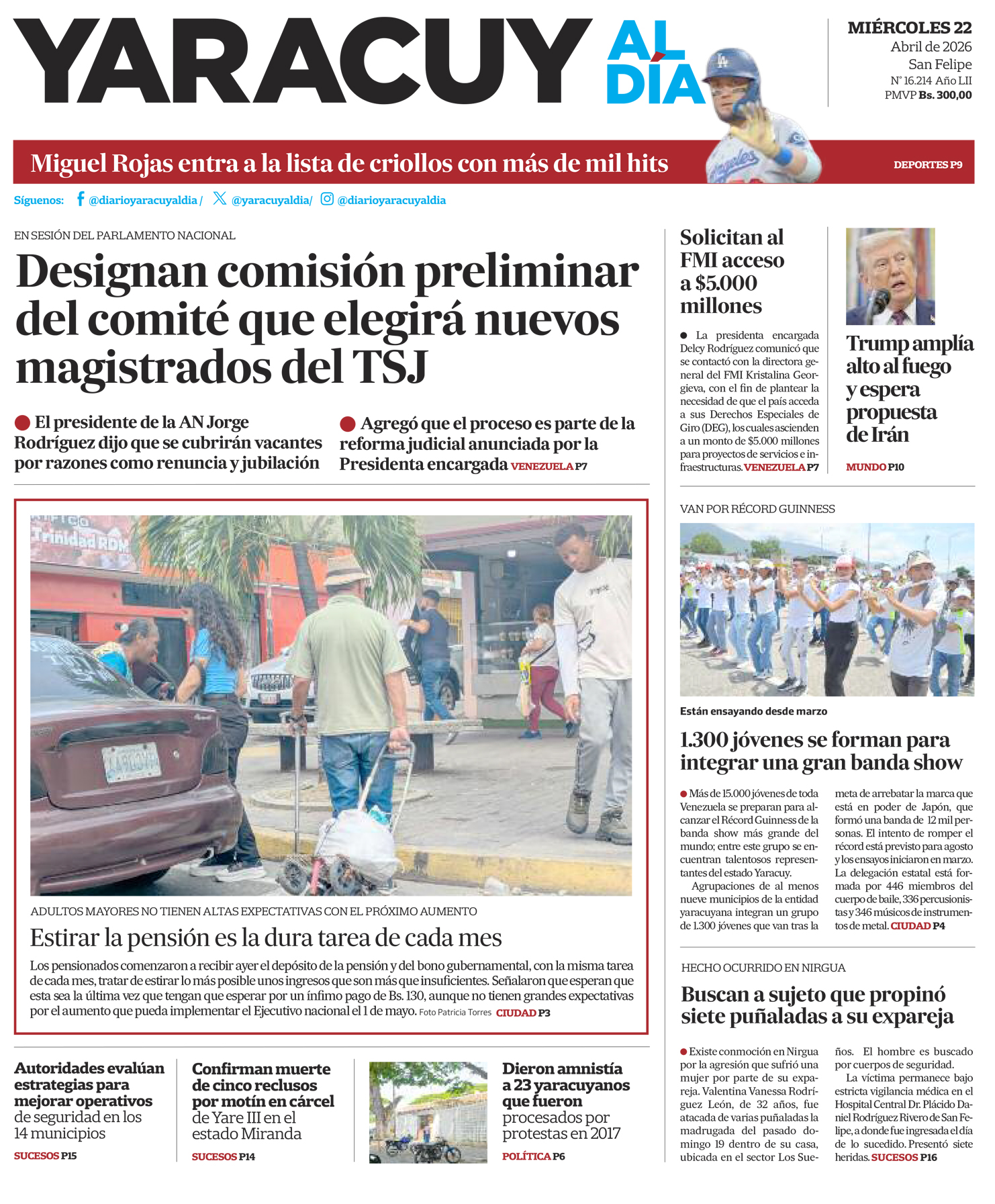 InicioPortadaPortada 22 de abril Portada Portada 22 de abril Por Redacción 22 de abril de 2026 Compartir FacebookTwitterWhatsApp - Publicidad - Compartir FacebookTwitterWhatsApp Artículo anteriorDouglas León Natera: 90 % de los hospitales están desabastecidos y abandonados ARTÍCULOS RELACIONADOS Portada Portada 21 de abril 21 de abril de 2026 Portada Portada 20 de abril 20 de abril de 2026 Portada Portada 17 de abril 17 de abril de 2026 Portada Portada 16 de abril 16 de abril de 2026 Portada Portada 15 de abril 15 de abril de 2026 Portada Portada 14 de abril 14 de abril de 2026 Últimas entradas Douglas León Natera: 90 % de los hospitales están desabastecidos y abandonados 21 de abril de 2026 Presidenta Delcy Rodríguez solicita al FMI acceso a $5.000 millones para servicios e infraestructuras 21 de abril de 2026 Asamblea Nacional aprueba comisión preliminar para iniciar proceso de selección de nuevos magistrados del TSJ 21 de abril de 2026 Optimizarán despliegues de seguridad en los 14 municipios del estado Yaracuy 21 de abril de 2026 Cargar más lo más leído Mujer detenida en Páez hace 9 días es una de las 25 personas arrestadas por ser promotoras del dólar no oficial 31 de mayo de 2025 ¡PSG gana su primera ‘orejona’ y hace historia! Golea 5-0 al Inter 31 de mayo de 2025 Fiscales que fueron destituidos del MP entregarán escrito ante el Departamento de RR HH en Caracas 7 de julio de 2025 Alias «El Niño» fue detenido en Veroes con droga y un arma de fuego, era investigado por comisión de inteligencia de la PNB 7 de julio de 2025 Cargar más TE PUEDE INTERESAR Douglas León Natera: 90 % de los hospitales están desabastecidos y abandonados 21 de abril de 2026 Presidenta Delcy Rodríguez solicita al FMI acceso a $5.000 millones para servicios e infraestructuras 21 de abril de 2026 Asamblea Nacional aprueba comisión preliminar para iniciar proceso de selección de nuevos magistrados del TSJ 21 de abril de 2026 Machado confía en que España acompañe en el futuro la causa democrática en Venezuela 21 de abril de 2026 Cargar más