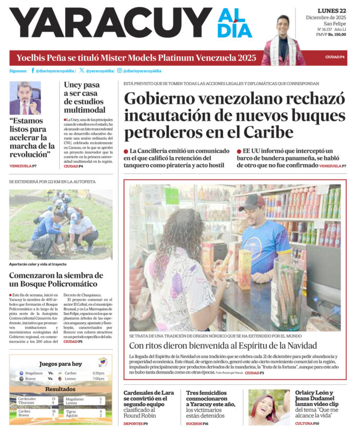 InicioPortadaPortada 22 de diciembre Portada Portada 22 de diciembre Por Redacción 22 de diciembre de 2025 Compartir FacebookTwitterWhatsApp - Publicidad - Compartir FacebookTwitterWhatsApp Artículo anteriorUNT pide respetar la soberanía de Venezuela sobre sus recursos energéticosArtículo siguienteInstan a la prevención ante repunte de cuadros virales en el estado ARTÍCULOS RELACIONADOS Portada Portada 19 de diciembre 19 de diciembre de 2025 Portada Portada 18 de diciembre 18 de diciembre de 2025 Portada Portada 17 de diciembre 17 de diciembre de 2025 Portada Portada 16 de diciembre 16 de diciembre de 2025 Portada Portada 15 de diciembre 15 de diciembre de 2025 Portada Portada 12 de diciembre 12 de diciembre de 2025 Últimas entradas Tres mujeres fueron asesinadas este año en Yaracuy: dos quemadas y otra por agresión física 22 de diciembre de 2025 Delcy Rodríguez: PDVSA alcanza producción de un millón 200 mil barriles 22 de diciembre de 2025 Instan a la prevención ante repunte de cuadros virales en el estado 22 de diciembre de 2025 UNT pide respetar la soberanía de Venezuela sobre sus recursos energéticos 21 de diciembre de 2025 Cargar más lo más leído Mujer detenida en Páez hace 9 días es una de las 25 personas arrestadas por ser promotoras del dólar no oficial 31 de mayo de 2025 ¡PSG gana su primera ‘orejona’ y hace historia! Golea 5-0 al Inter 31 de mayo de 2025 Fiscales que fueron destituidos del MP entregarán escrito ante el Departamento de RR HH en Caracas 7 de julio de 2025 Alias «El Niño» fue detenido en Veroes con droga y un arma de fuego, era investigado por comisión de inteligencia de la PNB 7 de julio de 2025 Cargar más TE PUEDE INTERESAR Delcy Rodríguez: PDVSA alcanza producción de un millón 200 mil barriles 22 de diciembre de 2025 UNT pide respetar la soberanía de Venezuela sobre sus recursos energéticos 21 de diciembre de 2025 Maduro califica de “piratería de corsarios” confiscación de buques petroleros por parte de Estados Unidos 21 de diciembre de 2025 La guerrilla del ELN anuncia tregua navideña en Colombia 21 de diciembre de 2025 Cargar más