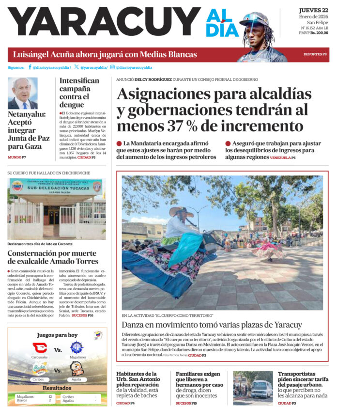 InicioPortadaPortada 22 de enero Portada Portada 22 de enero Por Redacción 22 de enero de 2026 Compartir FacebookTwitterWhatsApp - Publicidad - Compartir FacebookTwitterWhatsApp Artículo anteriorMPV propone cuatro medidas para recuperar el poder adquisitivo en el paísArtículo siguienteExcarcelado Rafael Tudares, yerno de Edmundo González ARTÍCULOS RELACIONADOS Portada Portada 21 de enero 21 de enero de 2026 Portada Portada 20 de enero 20 de enero de 2026 Portada Portada 19 de enero 19 de enero de 2026 Portada Portada 16 de enero 16 de enero de 2026 Portada Portada 13 de enero 13 de enero de 2026 Portada Portada 12 de enero 12 de enero de 2026 Últimas entradas Carlos Beltrán y Andruw Jones en el templo de los inmortales 22 de enero de 2026 Gobierno realiza 28 cambios de mando de las filas de la Fuerza Armada Nacional Bolivariana 22 de enero de 2026 Excarcelado Rafael Tudares, yerno de Edmundo González 22 de enero de 2026 MPV propone cuatro medidas para recuperar el poder adquisitivo en el país 21 de enero de 2026 Cargar más lo más leído Mujer detenida en Páez hace 9 días es una de las 25 personas arrestadas por ser promotoras del dólar no oficial 31 de mayo de 2025 ¡PSG gana su primera ‘orejona’ y hace historia! Golea 5-0 al Inter 31 de mayo de 2025 Fiscales que fueron destituidos del MP entregarán escrito ante el Departamento de RR HH en Caracas 7 de julio de 2025 Alias «El Niño» fue detenido en Veroes con droga y un arma de fuego, era investigado por comisión de inteligencia de la PNB 7 de julio de 2025 Cargar más TE PUEDE INTERESAR Carlos Beltrán y Andruw Jones en el templo de los inmortales 22 de enero de 2026 Gobierno realiza 28 cambios de mando de las filas de la Fuerza Armada Nacional Bolivariana 22 de enero de 2026 Excarcelado Rafael Tudares, yerno de Edmundo González 22 de enero de 2026 MPV propone cuatro medidas para recuperar el poder adquisitivo en el país 21 de enero de 2026 Cargar más