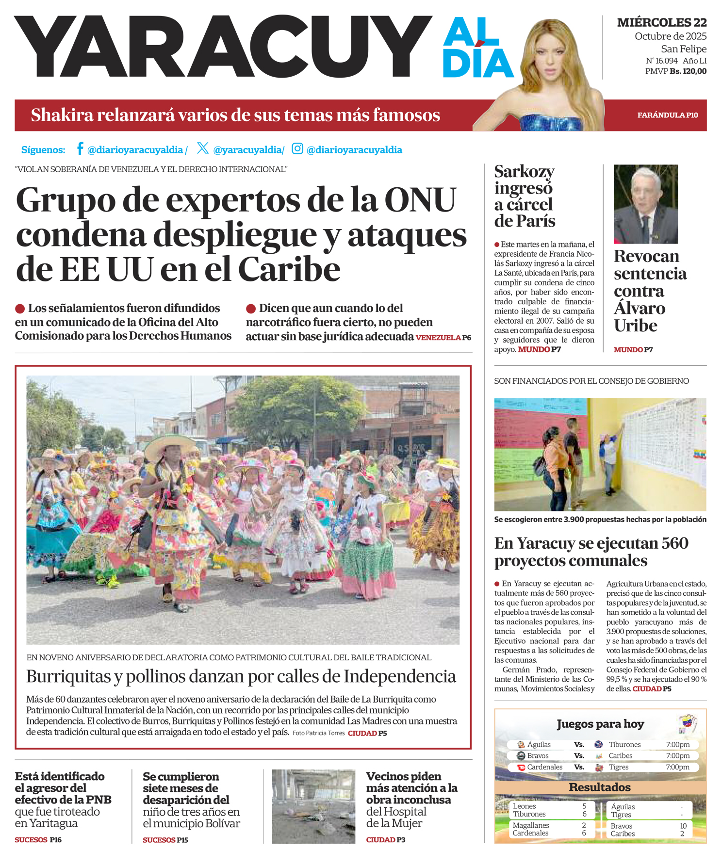 InicioPortadaPortada 22 de octubre Portada Portada 22 de octubre Por Redacción 22 de octubre de 2025 Compartir FacebookTwitterWhatsApp - Publicidad - Compartir FacebookTwitterWhatsApp Artículo anteriorMaduro pide crear app para que la gente reporte lo que vea y escuche en su comunidadArtículo siguienteGerardo Blyde niega participación en supuesta “negociación secreta” con diplomáticos ARTÍCULOS RELACIONADOS Portada Portada 21 de octubre 21 de octubre de 2025 Portada Portada 20 de octubre 20 de octubre de 2025 Portada Portada 17 de octubre 17 de octubre de 2025 Portada Portada 16 de octubre 16 de octubre de 2025 Portada Portada 15 de octubre 15 de octubre de 2025 Portada Portada 14 de octubre 14 de octubre de 2025 Últimas entradas En Táchira una aeronave se estrella por aparente falla mecánica, reportan fallecimiento de dos personas 22 de octubre de 2025 En España cerró lapso para solicitar nacionalidad para hijos y nietos de exiliados 22 de octubre de 2025 Orluis Aular renovó contrato con Movistar Team hasta finales de 2028 22 de octubre de 2025 Rusia lanzó ataque masivo con misiles y drones contra Kiev 22 de octubre de 2025 Cargar más lo más leído Mujer detenida en Páez hace 9 días es una de las 25 personas arrestadas por ser promotoras del dólar no oficial 31 de mayo de 2025 ¡PSG gana su primera ‘orejona’ y hace historia! Golea 5-0 al Inter 31 de mayo de 2025 Fiscales que fueron destituidos del MP entregarán escrito ante el Departamento de RR HH en Caracas 7 de julio de 2025 Alias «El Niño» fue detenido en Veroes con droga y un arma de fuego, era investigado por comisión de inteligencia de la PNB 7 de julio de 2025 Cargar más TE PUEDE INTERESAR En Táchira una aeronave se estrella por aparente falla mecánica, reportan fallecimiento de dos personas 22 de octubre de 2025 En España cerró lapso para solicitar nacionalidad para hijos y nietos de exiliados 22 de octubre de 2025 Rusia lanzó ataque masivo con misiles y drones contra Kiev 22 de octubre de 2025 Padrino López: Colombia cuenta con el respaldo moral y físico de la FANB en la frontera 22 de octubre de 2025 Cargar más