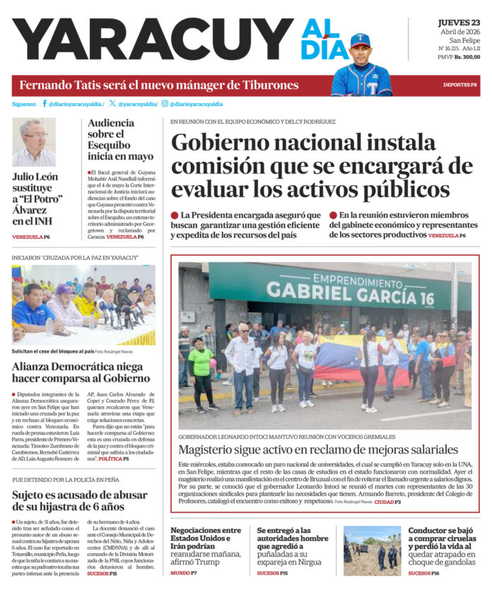 InicioPortadaPortada 23 de abril Portada Portada 23 de abril Por Redacción 23 de abril de 2026 Compartir FacebookTwitterWhatsApp - Publicidad - Compartir FacebookTwitterWhatsApp Artículo anteriorJosé Gregorio Correa: Urge un nuevo modelo económico y la derogación de la inamovilidad laboral ARTÍCULOS RELACIONADOS Portada Portada 22 de abril 22 de abril de 2026 Portada Portada 21 de abril 21 de abril de 2026 Portada Portada 20 de abril 20 de abril de 2026 Portada Portada 17 de abril 17 de abril de 2026 Portada Portada 16 de abril 16 de abril de 2026 Portada Portada 15 de abril 15 de abril de 2026 Últimas entradas José Gregorio Correa: Urge un nuevo modelo económico y la derogación de la inamovilidad laboral 22 de abril de 2026 Departamento de Estado de EE UU pide tender puentes en Venezuela tras reunión con la dirigente Dinorah Figuera 22 de abril de 2026 Delcy Rodríguez: Comisión de Evaluación de Activos Públicos blindará el crecimiento económico del país 22 de abril de 2026 Alianza Democrática aseguró que cruzada por la paz no le sigue el juego al Gobierno 22 de abril de 2026 Cargar más lo más leído Mujer detenida en Páez hace 9 días es una de las 25 personas arrestadas por ser promotoras del dólar no oficial 31 de mayo de 2025 ¡PSG gana su primera ‘orejona’ y hace historia! Golea 5-0 al Inter 31 de mayo de 2025 Fiscales que fueron destituidos del MP entregarán escrito ante el Departamento de RR HH en Caracas 7 de julio de 2025 Alias «El Niño» fue detenido en Veroes con droga y un arma de fuego, era investigado por comisión de inteligencia de la PNB 7 de julio de 2025 Cargar más TE PUEDE INTERESAR José Gregorio Correa: Urge un nuevo modelo económico y la derogación de la inamovilidad laboral 22 de abril de 2026 Departamento de Estado de EE UU pide tender puentes en Venezuela tras reunión con la dirigente Dinorah Figuera 22 de abril de 2026 Delcy Rodríguez: Comisión de Evaluación de Activos Públicos blindará el crecimiento económico del país 22 de abril de 2026 Fedegas: Venta híbrida de gasolina súper premium unificaría estaciones de servicio 22 de abril de 2026 Cargar más