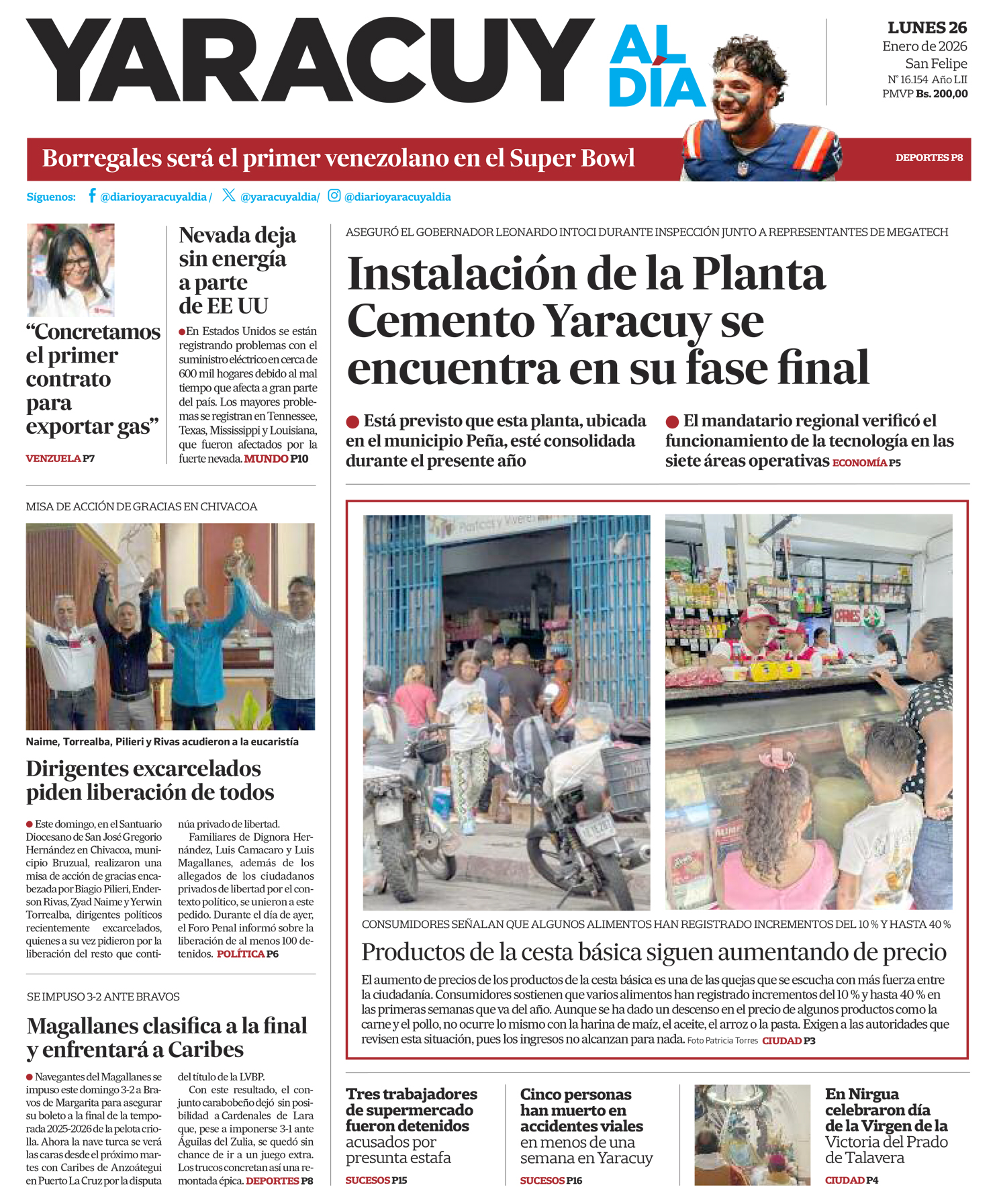 InicioPortadaPortada 26 de enero Portada Portada 26 de enero Por Redacción 26 de enero de 2026 Compartir FacebookTwitterWhatsApp - Publicidad - Compartir FacebookTwitterWhatsApp Artículo anteriorMagallanes concretó la remontada y apuntó su nombre en la finalArtículo siguienteEl «todo está muy caro» retumba en los comercios y mercados ARTÍCULOS RELACIONADOS Portada Portada 23 de enero 23 de enero de 2026 Portada Portada 22 de enero 22 de enero de 2026 Portada Portada 21 de enero 21 de enero de 2026 Portada Portada 20 de enero 20 de enero de 2026 Portada Portada 19 de enero 19 de enero de 2026 Portada Portada 16 de enero 16 de enero de 2026 Últimas entradas El «todo está muy caro» retumba en los comercios y mercados 26 de enero de 2026 Magallanes concretó la remontada y apuntó su nombre en la final 25 de enero de 2026 Gobierno anuncia el cierra de su primer contrato de exportación de gas para impulsar a Venezuela como potencia 25 de enero de 2026 En menos de una semana han fallecido cinco personas en diferentes accidentes de tránsito ocurridos en Yaracuy 25 de enero de 2026 Cargar más lo más leído Mujer detenida en Páez hace 9 días es una de las 25 personas arrestadas por ser promotoras del dólar no oficial 31 de mayo de 2025 ¡PSG gana su primera ‘orejona’ y hace historia! Golea 5-0 al Inter 31 de mayo de 2025 Fiscales que fueron destituidos del MP entregarán escrito ante el Departamento de RR HH en Caracas 7 de julio de 2025 Alias «El Niño» fue detenido en Veroes con droga y un arma de fuego, era investigado por comisión de inteligencia de la PNB 7 de julio de 2025 Cargar más TE PUEDE INTERESAR Magallanes concretó la remontada y apuntó su nombre en la final 25 de enero de 2026 Foro Penal: Registramos al menos 104 excarcelaciones este domingo 25 de enero de 2026 Gobierno anuncia el cierra de su primer contrato de exportación de gas para impulsar a Venezuela como potencia 25 de enero de 2026 Foro Penal anunció la excarcelación de al menos 80 presos este domingo #25ene 25 de enero de 2026 Cargar más