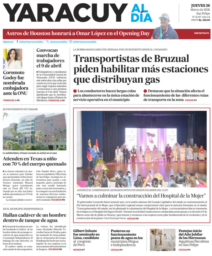 InicioPortadaPortada 26 de marzo Portada Portada 26 de marzo Por Redacción 26 de marzo de 2026 Compartir FacebookTwitterWhatsApp - Publicidad - Compartir FacebookTwitterWhatsApp Artículo anteriorTrabajadores y estudiantes de la UCV convocan a una marcha para el 9 de abril para exigir mejoras salarialesArtículo siguientePartido político Centrados en la Gente desconoce a Enrique Márquez como vocero oficial ARTÍCULOS RELACIONADOS Portada Portada 25 de marzo 25 de marzo de 2026 Portada Portada 24 de marzo 24 de marzo de 2026 Portada Portada 23 de marzo 23 de marzo de 2026 Portada Portada 20 de marzo 20 de marzo de 2026 Portada Portada 18 de marzo 19 de marzo de 2026 Portada Portada 18 de marzo 18 de marzo de 2026 Últimas entradas Partido político Centrados en la Gente desconoce a Enrique Márquez como vocero oficial 26 de marzo de 2026 Trabajadores y estudiantes de la UCV convocan a una marcha para el 9 de abril para exigir mejoras salariales 25 de marzo de 2026 Delcy Rodríguez: Este año hemos recibido a más de 120 empresas del sector energético 25 de marzo de 2026 Hombre fue asesinado a puñaladas y lanzado a un tanque de agua 25 de marzo de 2026 Cargar más lo más leído Mujer detenida en Páez hace 9 días es una de las 25 personas arrestadas por ser promotoras del dólar no oficial 31 de mayo de 2025 ¡PSG gana su primera ‘orejona’ y hace historia! Golea 5-0 al Inter 31 de mayo de 2025 Fiscales que fueron destituidos del MP entregarán escrito ante el Departamento de RR HH en Caracas 7 de julio de 2025 Alias «El Niño» fue detenido en Veroes con droga y un arma de fuego, era investigado por comisión de inteligencia de la PNB 7 de julio de 2025 Cargar más TE PUEDE INTERESAR Partido político Centrados en la Gente desconoce a Enrique Márquez como vocero oficial 26 de marzo de 2026 Trabajadores y estudiantes de la UCV convocan a una marcha para el 9 de abril para exigir mejoras salariales 25 de marzo de 2026 Delcy Rodríguez: Este año hemos recibido a más de 120 empresas del sector energético 25 de marzo de 2026 Irán dice que «no tiene la intención de negociar» mientras la Casa Blanca amenaza con «desatar el infierno» 25 de marzo de 2026 Cargar más