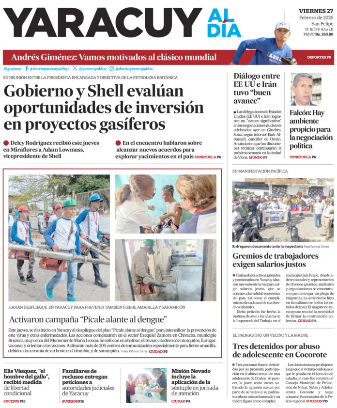 InicioPortadaPortada 27 de febrero Portada Portada 27 de febrero Por Redacción 27 de febrero de 2026 Compartir FacebookTwitterWhatsApp - Publicidad - Compartir FacebookTwitterWhatsApp Artículo anteriorHenri Falcón: Hay un ambiente propicio para la negociación y el encuentro políticoArtículo siguienteJorge Arreaza informó que han recibido 7.461 solicitudes de amnistía a solo una semana de haberse aprobado la ley ARTÍCULOS RELACIONADOS Portada Portada 25 de febrero 25 de febrero de 2026 Portada Portada 24 de febrero 24 de febrero de 2026 Portada Portada 23 de febrero 23 de febrero de 2026 Portada Portada 20 de febrero 20 de febrero de 2026 Portada Portada 18 de febrero 18 de febrero de 2026 Portada Portada 17 de febrero 17 de febrero de 2026 Últimas entradas Jorge Arreaza informó que han recibido 7.461 solicitudes de amnistía a solo una semana de haberse aprobado la ley 27 de febrero de 2026 Henri Falcón: Hay un ambiente propicio para la negociación y el encuentro político 26 de febrero de 2026 Delcy Rodríguez y directivos de la petrolera británica Shell evaluaron proyectos gasíferos 26 de febrero de 2026 Artesanos de arcilla fueron los protagonistas del segundo encuentro de manos creadoras 26 de febrero de 2026 Cargar más lo más leído Mujer detenida en Páez hace 9 días es una de las 25 personas arrestadas por ser promotoras del dólar no oficial 31 de mayo de 2025 ¡PSG gana su primera ‘orejona’ y hace historia! Golea 5-0 al Inter 31 de mayo de 2025 Fiscales que fueron destituidos del MP entregarán escrito ante el Departamento de RR HH en Caracas 7 de julio de 2025 Alias «El Niño» fue detenido en Veroes con droga y un arma de fuego, era investigado por comisión de inteligencia de la PNB 7 de julio de 2025 Cargar más TE PUEDE INTERESAR Jorge Arreaza informó que han recibido 7.461 solicitudes de amnistía a solo una semana de haberse aprobado la ley 27 de febrero de 2026 Henri Falcón: Hay un ambiente propicio para la negociación y el encuentro político 26 de febrero de 2026 Delcy Rodríguez y directivos de la petrolera británica Shell evaluaron proyectos gasíferos 26 de febrero de 2026 Venezuela modifica nuevamente el róster para el Clásico Mundial 26 de febrero de 2026 Cargar más