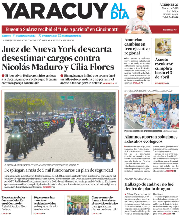InicioPortadaPortada 27 de marzo Portada Portada 27 de marzo Por Redacción 27 de marzo de 2026 Compartir FacebookTwitterWhatsApp - Publicidad - Compartir FacebookTwitterWhatsApp Artículo anteriorDelcy Rodríguez se reunió con equipo ministerial para evaluar medidas económicas ARTÍCULOS RELACIONADOS Portada Portada 26 de marzo 26 de marzo de 2026 Portada Portada 25 de marzo 25 de marzo de 2026 Portada Portada 24 de marzo 24 de marzo de 2026 Portada Portada 23 de marzo 23 de marzo de 2026 Portada Portada 20 de marzo 20 de marzo de 2026 Portada Portada 18 de marzo 19 de marzo de 2026 Últimas entradas Delcy Rodríguez se reunió con equipo ministerial para evaluar medidas económicas 26 de marzo de 2026 Ejecutan trabajos de rehabilitación integral en el Centro de Rehabilitación Flor Eulacio de Independencia 26 de marzo de 2026 Asueto escolar por la Semana Santa será desde el lunes 30 de marzo al 3 de abril 26 de marzo de 2026 Juez rechaza desestimar caso contra Maduro y Flores por conflicto en el pago a abogados 26 de marzo de 2026 Cargar más lo más leído Mujer detenida en Páez hace 9 días es una de las 25 personas arrestadas por ser promotoras del dólar no oficial 31 de mayo de 2025 ¡PSG gana su primera ‘orejona’ y hace historia! Golea 5-0 al Inter 31 de mayo de 2025 Fiscales que fueron destituidos del MP entregarán escrito ante el Departamento de RR HH en Caracas 7 de julio de 2025 Alias «El Niño» fue detenido en Veroes con droga y un arma de fuego, era investigado por comisión de inteligencia de la PNB 7 de julio de 2025 Cargar más TE PUEDE INTERESAR Delcy Rodríguez se reunió con equipo ministerial para evaluar medidas económicas 26 de marzo de 2026 Ejecutan trabajos de rehabilitación integral en el Centro de Rehabilitación Flor Eulacio de Independencia 26 de marzo de 2026 Asueto escolar por la Semana Santa será desde el lunes 30 de marzo al 3 de abril 26 de marzo de 2026 Juez rechaza desestimar caso contra Maduro y Flores por conflicto en el pago a abogados 26 de marzo de 2026 Cargar más