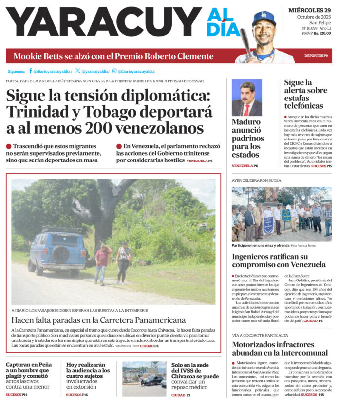 InicioPortadaPortada 29 de octubre Portada Portada 29 de octubre Por Redacción 29 de octubre de 2025 Compartir FacebookTwitterWhatsApp - Publicidad - Compartir FacebookTwitterWhatsApp Artículo anteriorEl presidente Nicolás Maduro anuncia a los nuevos padrinos y madrinas de los estadosArtículo siguienteCavecol: Exportaciones de Venezuela a Colombia caen 16,9 % entre enero y agosto ARTÍCULOS RELACIONADOS Portada Portada 28 de octubre 28 de octubre de 2025 Portada Portada 27 de octubre 27 de octubre de 2025 Portada Portada 24 de octubre 24 de octubre de 2025 Portada Portada 23 de octubre 23 de octubre de 2025 Portada Portada 22 de octubre 22 de octubre de 2025 Portada Portada 21 de octubre 21 de octubre de 2025 Últimas entradas Declaran a Jamaica «zona catastrófica» tras paso del huracán Melissa 29 de octubre de 2025 Convalidar un reposo es una ardua labor para el trabajador y también para el personal del IVSS 29 de octubre de 2025 Cavecol: Exportaciones de Venezuela a Colombia caen 16,9 % entre enero y agosto 29 de octubre de 2025 El presidente Nicolás Maduro anuncia a los nuevos padrinos y madrinas de los estados 28 de octubre de 2025 Cargar más lo más leído Mujer detenida en Páez hace 9 días es una de las 25 personas arrestadas por ser promotoras del dólar no oficial 31 de mayo de 2025 ¡PSG gana su primera ‘orejona’ y hace historia! Golea 5-0 al Inter 31 de mayo de 2025 Fiscales que fueron destituidos del MP entregarán escrito ante el Departamento de RR HH en Caracas 7 de julio de 2025 Alias «El Niño» fue detenido en Veroes con droga y un arma de fuego, era investigado por comisión de inteligencia de la PNB 7 de julio de 2025 Cargar más TE PUEDE INTERESAR Una alimentación saludable es clave para superar el cáncer de mama 29 de octubre de 2025 Declaran a Jamaica «zona catastrófica» tras paso del huracán Melissa 29 de octubre de 2025 Cavecol: Exportaciones de Venezuela a Colombia caen 16,9 % entre enero y agosto 29 de octubre de 2025 El presidente Nicolás Maduro anuncia a los nuevos padrinos y madrinas de los estados 28 de octubre de 2025 Cargar más