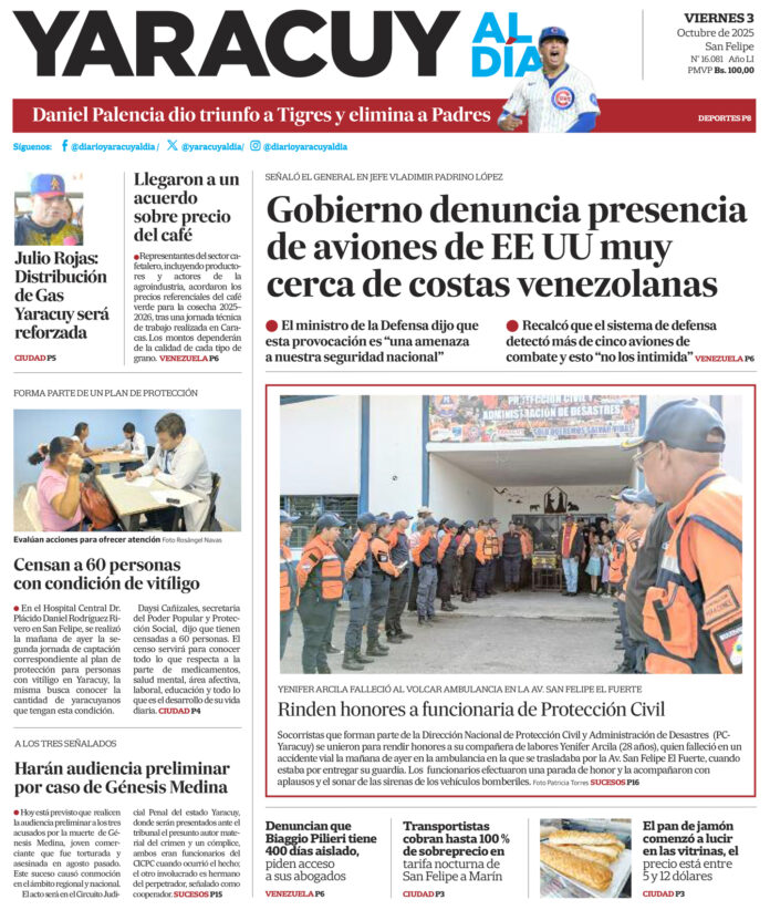 InicioPortadaPortada 3 de octubre Portada Portada 3 de octubre Por Redacción 3 de octubre de 2025 Compartir FacebookTwitterWhatsApp - Publicidad - Compartir FacebookTwitterWhatsApp Artículo anteriorPiden libertad para el dirigente yaracuyano Biagio Pilieri a 400 días de su detenciónArtículo siguienteEste #3oct está prevista la audiencia preliminar de los tres investigados por el asesinato de Génesis Medina ARTÍCULOS RELACIONADOS Portada Portada 2 de octubre 2 de octubre de 2025 Portada Portada 1 de octubre 1 de octubre de 2025 Portada Portada 30 de septiembre 30 de septiembre de 2025 Portada Portada 29 de septiembre 29 de septiembre de 2025 Portada Portada 26 de septiembre 26 de septiembre de 2025 Portada Portada 26 de septiembre 25 de septiembre de 2025 Últimas entradas Caso de Génesis Medina pasa a juicio, los tres implicados seguirán tras las rejas 3 de octubre de 2025 Falleció Roxana Parra, enfermera que fue rociada con gasolina por su expareja en Aroa, Yaracuy 3 de octubre de 2025 Ministro de la Defensa confirma muerte de dos oficiales militares en caída de helicóptero en Aragua 3 de octubre de 2025 Trump lanza ultimátum a Hamás para que acepte acuerdo de paz o se «desatará un infierno» en Gaza» 3 de octubre de 2025 Cargar más lo más leído Mujer detenida en Páez hace 9 días es una de las 25 personas arrestadas por ser promotoras del dólar no oficial 31 de mayo de 2025 ¡PSG gana su primera ‘orejona’ y hace historia! Golea 5-0 al Inter 31 de mayo de 2025 Fiscales que fueron destituidos del MP entregarán escrito ante el Departamento de RR HH en Caracas 7 de julio de 2025 Alias «El Niño» fue detenido en Veroes con droga y un arma de fuego, era investigado por comisión de inteligencia de la PNB 7 de julio de 2025 Cargar más TE PUEDE INTERESAR Caso de Génesis Medina pasa a juicio, los tres implicados seguirán tras las rejas 3 de octubre de 2025 Ministro de la Defensa confirma muerte de dos oficiales militares en caída de helicóptero en Aragua 3 de octubre de 2025 Trump lanza ultimátum a Hamás para que acepte acuerdo de paz o se «desatará un infierno» en Gaza» 3 de octubre de 2025 Dos militares habrían fallecido al precipitarse helicóptero de la GNB en el estado Aragua+Video 3 de octubre de 2025 Cargar más