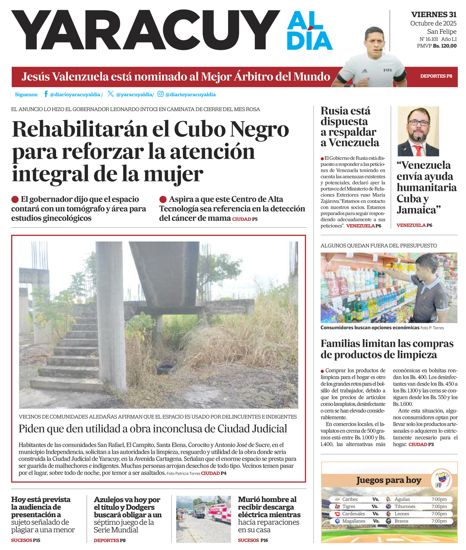 InicioPortadaPortada 31 de octubre Portada Portada 31 de octubre Por Redacción 31 de octubre de 2025 Compartir FacebookTwitterWhatsApp - Publicidad - Compartir FacebookTwitterWhatsApp Artículo anteriorRusia informa que está dispuesta a respaldar a Venezuela ante las amenazas de Estados UnidosArtículo siguienteComprar los productos de limpieza para el hogar es otro de los retos para el bolsillo ARTÍCULOS RELACIONADOS Portada Portada 30 de octubre 30 de octubre de 2025 Portada Portada 29 de octubre 29 de octubre de 2025 Portada Portada 28 de octubre 28 de octubre de 2025 Portada Portada 27 de octubre 27 de octubre de 2025 Portada Portada 24 de octubre 24 de octubre de 2025 Portada Portada 23 de octubre 23 de octubre de 2025 Últimas entradas El venezolano Jesús Valenzuela ha sido nominado a Mejor Árbitro del Mundo 31 de octubre de 2025 Israel entrega a Gaza otros 30 cadáveres sin identificar 31 de octubre de 2025 Fuertes lluvias ocasionaron anegaciones y caída de árboles en Falcón 31 de octubre de 2025 Consumo de carne de pollo en Venezuela está en alrededor de 25 kilos per cápita al año 31 de octubre de 2025 Cargar más lo más leído Mujer detenida en Páez hace 9 días es una de las 25 personas arrestadas por ser promotoras del dólar no oficial 31 de mayo de 2025 ¡PSG gana su primera ‘orejona’ y hace historia! Golea 5-0 al Inter 31 de mayo de 2025 Fiscales que fueron destituidos del MP entregarán escrito ante el Departamento de RR HH en Caracas 7 de julio de 2025 Alias «El Niño» fue detenido en Veroes con droga y un arma de fuego, era investigado por comisión de inteligencia de la PNB 7 de julio de 2025 Cargar más TE PUEDE INTERESAR El venezolano Jesús Valenzuela ha sido nominado a Mejor Árbitro del Mundo 31 de octubre de 2025 Israel entrega a Gaza otros 30 cadáveres sin identificar 31 de octubre de 2025 Fuertes lluvias ocasionaron anegaciones y caída de árboles en Falcón 31 de octubre de 2025 Consumo de carne de pollo en Venezuela está en alrededor de 25 kilos per cápita al año 31 de octubre de 2025 Cargar más