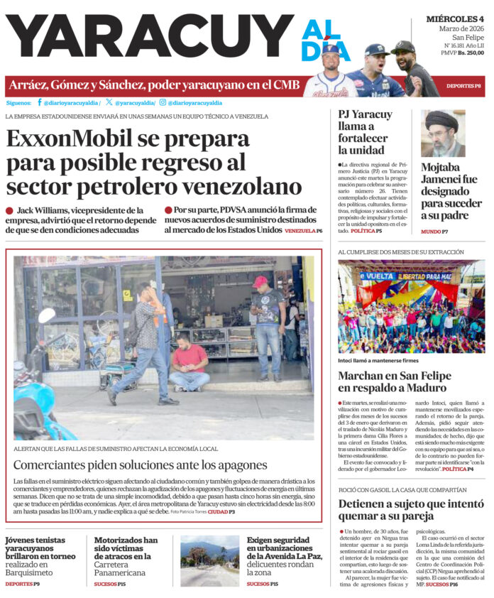 InicioPortadaPortada 4 de marzo Portada Portada 4 de marzo Por Redacción 4 de marzo de 2026 Compartir FacebookTwitterWhatsApp - Publicidad - Compartir FacebookTwitterWhatsApp Artículo anteriorJorge Arreaza advierte que amnistiado que cometa un nuevo delito será juzgadoArtículo siguienteApagones y fluctuaciones siguen golpeando al comerciante y emprendedor ARTÍCULOS RELACIONADOS Portada Portada 3 de marzo 3 de marzo de 2026 Portada Portada 27 de febrero 27 de febrero de 2026 Portada Portada 25 de febrero 25 de febrero de 2026 Portada Portada 24 de febrero 24 de febrero de 2026 Portada Portada 23 de febrero 23 de febrero de 2026 Portada Portada 20 de febrero 20 de febrero de 2026 Últimas entradas Gobernador Intoci: Estamos firmes para defender la revolución en el escenario que sea 4 de marzo de 2026 Apagones y fluctuaciones siguen golpeando al comerciante y emprendedor 4 de marzo de 2026 Jorge Arreaza advierte que amnistiado que cometa un nuevo delito será juzgado 3 de marzo de 2026 Delcy Rodríguez ratificó su respaldo para potenciar la producción en el país 3 de marzo de 2026 Cargar más lo más leído Mujer detenida en Páez hace 9 días es una de las 25 personas arrestadas por ser promotoras del dólar no oficial 31 de mayo de 2025 ¡PSG gana su primera ‘orejona’ y hace historia! Golea 5-0 al Inter 31 de mayo de 2025 Fiscales que fueron destituidos del MP entregarán escrito ante el Departamento de RR HH en Caracas 7 de julio de 2025 Alias «El Niño» fue detenido en Veroes con droga y un arma de fuego, era investigado por comisión de inteligencia de la PNB 7 de julio de 2025 Cargar más TE PUEDE INTERESAR Jorge Arreaza advierte que amnistiado que cometa un nuevo delito será juzgado 3 de marzo de 2026 Delcy Rodríguez ratificó su respaldo para potenciar la producción en el país 3 de marzo de 2026 ExxonMobil anunció que en unas semanas enviará un equipo técnico a Venezuela 3 de marzo de 2026 Trump amenaza con cortar el comercio e imponer un embargo a España por su postura con Irán 3 de marzo de 2026 Cargar más