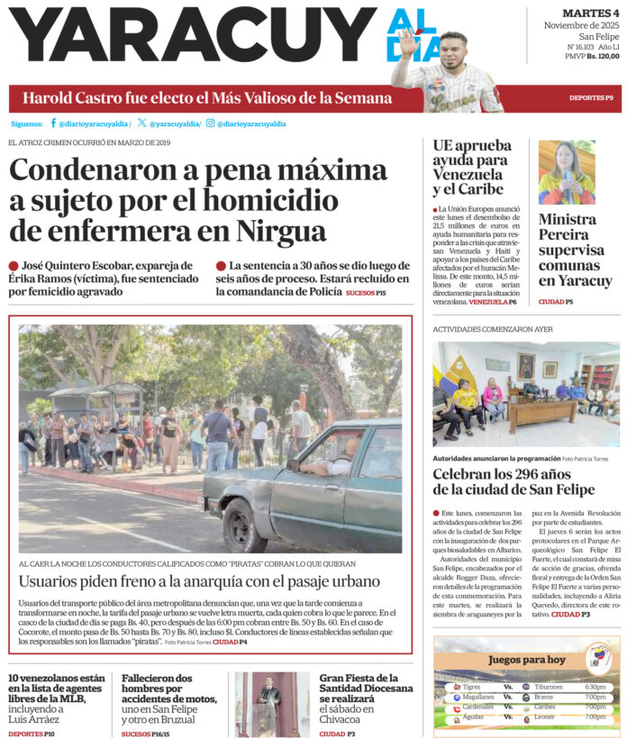 InicioPortadaPortada 4 de noviembre Portada Portada 4 de noviembre Por Redacción 4 de noviembre de 2025 Compartir FacebookTwitterWhatsApp - Publicidad - Compartir FacebookTwitterWhatsApp Artículo anteriorMinistra de Economía y madrina del 1×10 para Yaracuy estuvo en el estado y conoció el trabajo de las comunasArtículo siguienteEn la tarde – noche la anarquía con el precio del pasaje urbano aumenta ARTÍCULOS RELACIONADOS Portada Portada 3 de noviembre 3 de noviembre de 2025 Portada Portada 31 de octubre 31 de octubre de 2025 Portada Portada 30 de octubre 30 de octubre de 2025 Portada Portada 29 de octubre 29 de octubre de 2025 Portada Portada 28 de octubre 28 de octubre de 2025 Portada Portada 27 de octubre 27 de octubre de 2025 Últimas entradas Fedecámaras presentará su plan de inversión y empleo nacional en diciembre 4 de noviembre de 2025 Diosdado Cabello: Venezuela se reserva las acciones contra Trinidad y Tobago por sus últimas decisiones 4 de noviembre de 2025 En la tarde – noche la anarquía con el precio del pasaje urbano aumenta 4 de noviembre de 2025 Ministra de Economía y madrina del 1×10 para Yaracuy estuvo en el estado y conoció el trabajo de las comunas 3 de noviembre de 2025 Cargar más lo más leído Mujer detenida en Páez hace 9 días es una de las 25 personas arrestadas por ser promotoras del dólar no oficial 31 de mayo de 2025 ¡PSG gana su primera ‘orejona’ y hace historia! Golea 5-0 al Inter 31 de mayo de 2025 Fiscales que fueron destituidos del MP entregarán escrito ante el Departamento de RR HH en Caracas 7 de julio de 2025 Alias «El Niño» fue detenido en Veroes con droga y un arma de fuego, era investigado por comisión de inteligencia de la PNB 7 de julio de 2025 Cargar más TE PUEDE INTERESAR Fedecámaras presentará su plan de inversión y empleo nacional en diciembre 4 de noviembre de 2025 Diosdado Cabello: Venezuela se reserva las acciones contra Trinidad y Tobago por sus últimas decisiones 4 de noviembre de 2025 Ministra de Economía y madrina del 1×10 para Yaracuy estuvo en el estado y conoció el trabajo de las comunas 3 de noviembre de 2025 La Unión Europea destina 21,5 millones de euros en ayuda humanitaria para Venezuela, Haití y el Caribe 3 de noviembre de 2025 Cargar más