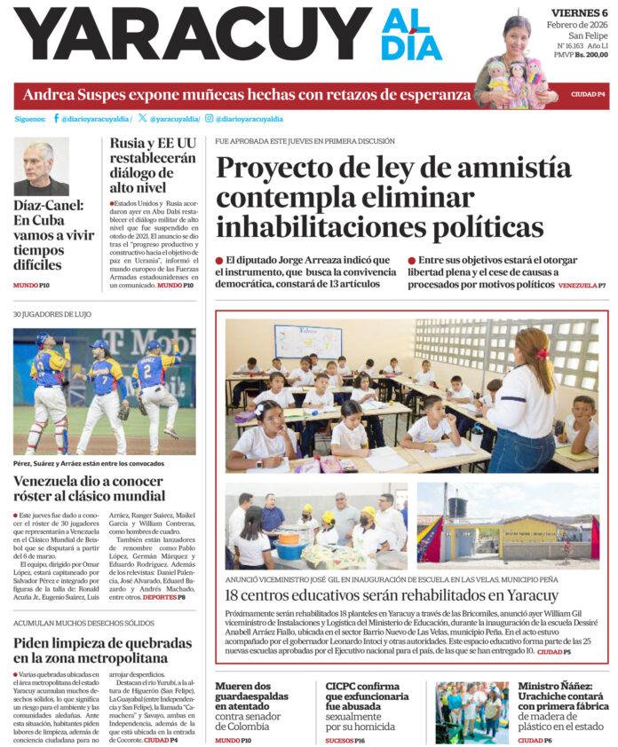 InicioPortadaPortada 6 de febrero Portada Portada 6 de febrero Por Redacción 6 de febrero de 2026 Compartir FacebookTwitterWhatsApp - Publicidad - Compartir FacebookTwitterWhatsApp Artículo anteriorUn sector de la oposición defiende conversar con el Gobierno para garantizar soluciones ARTÍCULOS RELACIONADOS Portada Portada 3 de febrero 3 de febrero de 2026 Portada Portada 2 de febrero 2 de febrero de 2026 Portada Portada 30 de enero 30 de enero de 2026 Portada Portada 29 de enero 29 de enero de 2026 Portada Portada 28 de enero 28 de enero de 2026 Portada Portada 27 de enero 27 de enero de 2026 Últimas entradas Un sector de la oposición defiende conversar con el Gobierno para garantizar soluciones 5 de febrero de 2026 El proyecto de la Ley de Amnistía para la Convivencia Democrática revoca inhabilitaciones políticas 5 de febrero de 2026 Sector Barrio Nuevo del eje Las Velas cuenta con nueva escuela dotada en su totalidad 5 de febrero de 2026 Uney instala la cátedra libre «Edgar Abreu Olivo» como parte de su celebración aniversaria 5 de febrero de 2026 Cargar más lo más leído Mujer detenida en Páez hace 9 días es una de las 25 personas arrestadas por ser promotoras del dólar no oficial 31 de mayo de 2025 ¡PSG gana su primera ‘orejona’ y hace historia! Golea 5-0 al Inter 31 de mayo de 2025 Fiscales que fueron destituidos del MP entregarán escrito ante el Departamento de RR HH en Caracas 7 de julio de 2025 Alias «El Niño» fue detenido en Veroes con droga y un arma de fuego, era investigado por comisión de inteligencia de la PNB 7 de julio de 2025 Cargar más TE PUEDE INTERESAR Un sector de la oposición defiende conversar con el Gobierno para garantizar soluciones 5 de febrero de 2026 El proyecto de la Ley de Amnistía para la Convivencia Democrática revoca inhabilitaciones políticas 5 de febrero de 2026 Con colorido desfile acuático se dio inicio al Carnaval de Venecia 20260 5 de febrero de 2026 Asamblea Nacional aprueba por unanimidad avanzar en la Ley de Amnistía 5 de febrero de 2026 Cargar más