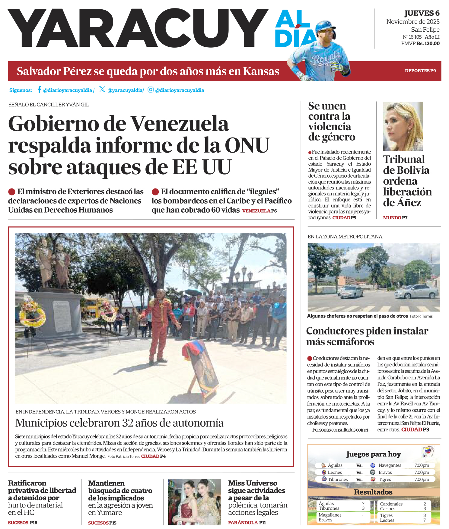 InicioPortadaPortada 6 de noviembre Portada Portada 6 de noviembre Por Redacción 6 de noviembre de 2025 Compartir FacebookTwitterWhatsApp - Publicidad - Compartir FacebookTwitterWhatsApp Artículo anteriorCapriles pide una solución urgente a la crisis política e insta a Maduro a negociarArtículo siguienteEn algunas avenidas necesitan semáforos, en otras que respeten las señales ARTÍCULOS RELACIONADOS Portada Portada 5 de noviembre 5 de noviembre de 2025 Portada Portada 4 de noviembre 4 de noviembre de 2025 Portada Portada 3 de noviembre 3 de noviembre de 2025 Portada Portada 31 de octubre 31 de octubre de 2025 Portada Portada 30 de octubre 30 de octubre de 2025 Portada Portada 29 de octubre 29 de octubre de 2025 Últimas entradas En algunas avenidas necesitan semáforos, en otras que respeten las señales 6 de noviembre de 2025 Capriles pide una solución urgente a la crisis política e insta a Maduro a negociar 5 de noviembre de 2025 Yván Gil: ONU afirma que bombardeos de Estados Unidos en el Caribe son ilegales 5 de noviembre de 2025 Mantienen privativa de libertad a implicados en el hurto dentro del Hospital Central de San Felipe (Yaracuy) 5 de noviembre de 2025 Cargar más lo más leído Mujer detenida en Páez hace 9 días es una de las 25 personas arrestadas por ser promotoras del dólar no oficial 31 de mayo de 2025 ¡PSG gana su primera ‘orejona’ y hace historia! Golea 5-0 al Inter 31 de mayo de 2025 Fiscales que fueron destituidos del MP entregarán escrito ante el Departamento de RR HH en Caracas 7 de julio de 2025 Alias «El Niño» fue detenido en Veroes con droga y un arma de fuego, era investigado por comisión de inteligencia de la PNB 7 de julio de 2025 Cargar más TE PUEDE INTERESAR Capriles pide una solución urgente a la crisis política e insta a Maduro a negociar 5 de noviembre de 2025 Yván Gil: ONU afirma que bombardeos de Estados Unidos en el Caribe son ilegales 5 de noviembre de 2025 Salvador Pérez es ratificado con los Reales por dos temporadas más 5 de noviembre de 2025 El Supremo de Bolivia anula sentencia contra expresidenta Jeanine Áñez y ordena su pronta liberación 5 de noviembre de 2025 Cargar más