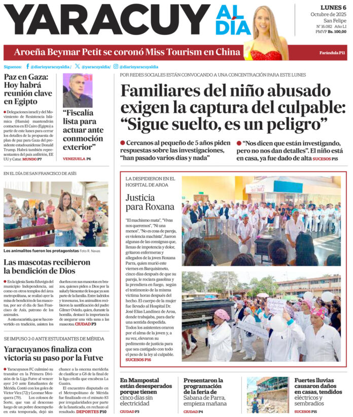 InicioPortadaPortada 6 de octubre Portada Portada 6 de octubre Por Redacción 6 de octubre de 2025 Compartir FacebookTwitterWhatsApp - Publicidad - EtiquetasPortada Compartir FacebookTwitterWhatsApp Artículo anteriorConsecomercio estima aumento de 10 % en las ventas en diciembreArtículo siguienteConmemoraron el Día Internacional de la Educación Vial con actividades formativas ARTÍCULOS RELACIONADOS Portada Portada 7 de septiembre 7 de octubre de 2025 Portada Portada 3 de octubre 3 de octubre de 2025 Portada Portada 2 de octubre 2 de octubre de 2025 Portada Portada 1 de octubre 1 de octubre de 2025 Portada Portada 30 de septiembre 30 de septiembre de 2025 Portada Portada 29 de septiembre 29 de septiembre de 2025 Últimas entradas Avanza construcción de Zona Juventud en el urbanismo la Ciudadela en San Felipe 7 de octubre de 2025 Benito Rivero formará parte del cuerpo técnico de la vinotinto en 7 de octubre de 2025 Reinauguran Escuela Aurelio García en la Comunidad El Cupido, municipio Bolívar 7 de octubre de 2025 Pagar el servicio de internet desajusta cualquier presupuesto familiar 7 de octubre de 2025 Cargar más lo más leído Mujer detenida en Páez hace 9 días es una de las 25 personas arrestadas por ser promotoras del dólar no oficial 31 de mayo de 2025 ¡PSG gana su primera ‘orejona’ y hace historia! Golea 5-0 al Inter 31 de mayo de 2025 Fiscales que fueron destituidos del MP entregarán escrito ante el Departamento de RR HH en Caracas 7 de julio de 2025 Alias «El Niño» fue detenido en Veroes con droga y un arma de fuego, era investigado por comisión de inteligencia de la PNB 7 de julio de 2025 Cargar más TE PUEDE INTERESAR Avanza construcción de Zona Juventud en el urbanismo la Ciudadela en San Felipe 7 de octubre de 2025 Benito Rivero formará parte del cuerpo técnico de la vinotinto en 7 de octubre de 2025 Reinauguran Escuela Aurelio García en la Comunidad El Cupido, municipio Bolívar 7 de octubre de 2025 Comenzaron labores para canalizar el río Yaracuy ante crecida por las lluvias en La Hoya 7 de octubre de 2025 Cargar más