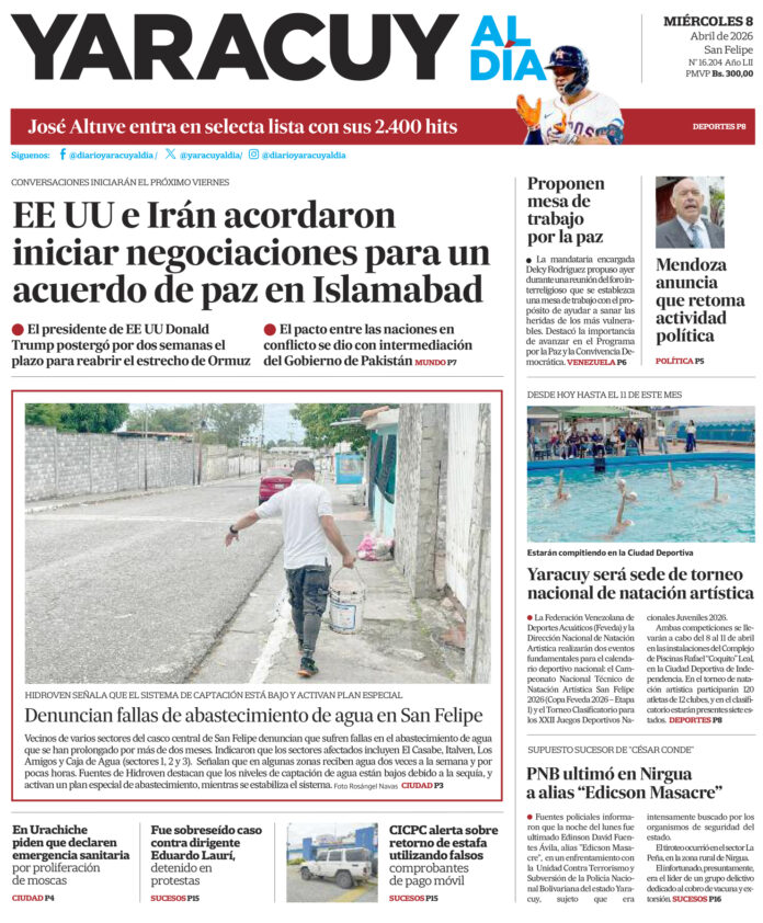 InicioPortadaPortada 8 de abril Portada Portada 8 de abril Por Redacción 8 de abril de 2026 Compartir FacebookTwitterWhatsApp - Publicidad - Compartir FacebookTwitterWhatsApp Artículo anteriorJuez federal niega solicitud de defensa de Maduro para compartir pruebas con otros coacusadosArtículo siguienteAsamblea Nacional difiere nuevamente la segunda discusión de la ley de minas ARTÍCULOS RELACIONADOS Portada Portada 10 de abril 10 de abril de 2026 Portada Portada 9 de abril 9 de abril de 2026 Portada Portada 7 de abril 7 de abril de 2026 Portada Portada 6 de abril 6 de abril de 2026 Portada Portada 1 de abril 1 de abril de 2026 Portada Portada 31 de marzo 31 de marzo de 2026 Últimas entradas La PNB impidió que la marcha de los gremios de trabajadores lograra entrar a Miraflores 9 de abril de 2026 Larry Devoe es ratificado como fiscal general y Eglée González asumirá la Defensoría del Pueblo 9 de abril de 2026 Venezuela y Granada buscan establecer canales de comunicación más directos 9 de abril de 2026 CE «Tribu Jirahara» declarado Patrimonio Cultural y Educativo de Bruzual 9 de abril de 2026 Cargar más lo más leído Mujer detenida en Páez hace 9 días es una de las 25 personas arrestadas por ser promotoras del dólar no oficial 31 de mayo de 2025 ¡PSG gana su primera ‘orejona’ y hace historia! Golea 5-0 al Inter 31 de mayo de 2025 Fiscales que fueron destituidos del MP entregarán escrito ante el Departamento de RR HH en Caracas 7 de julio de 2025 Alias «El Niño» fue detenido en Veroes con droga y un arma de fuego, era investigado por comisión de inteligencia de la PNB 7 de julio de 2025 Cargar más TE PUEDE INTERESAR Portada 10 de abril 10 de abril de 2026 La PNB impidió que la marcha de los gremios de trabajadores lograra entrar a Miraflores 9 de abril de 2026 Larry Devoe es ratificado como fiscal general y Eglée González asumirá la Defensoría del Pueblo 9 de abril de 2026 Venezuela y Granada buscan establecer canales de comunicación más directos 9 de abril de 2026 Cargar más