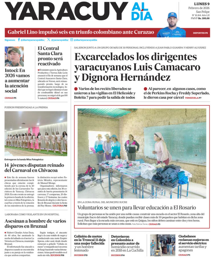 InicioPortadaPortada 9 de febrero Portada Portada 9 de febrero Por Redacción 9 de febrero de 2026 Compartir FacebookTwitterWhatsApp - Publicidad - Compartir FacebookTwitterWhatsApp Artículo anteriorColombia y Cuba logran triunfo por noqueada en Serie de las AméricasArtículo siguienteApagones y tarifas: la batalla de los ciudadanos con Corpoelec ARTÍCULOS RELACIONADOS Portada Portada 6 de febrero 6 de febrero de 2026 Portada Portada 3 de febrero 3 de febrero de 2026 Portada Portada 2 de febrero 2 de febrero de 2026 Portada Portada 30 de enero 30 de enero de 2026 Portada Portada 29 de enero 29 de enero de 2026 Portada Portada 28 de enero 28 de enero de 2026 Últimas entradas Jesús Faría: El tema salarial es la principal prioridad del Gobierno nacional 9 de febrero de 2026 Apagones y tarifas: la batalla de los ciudadanos con Corpoelec 9 de febrero de 2026 Colombia y Cuba logran triunfo por noqueada en Serie de las Américas 9 de febrero de 2026 Foro Penal anuncia 35 excarcelaciones, Dinora Hernández, Luis Camacaro y Juan Pablo Guanipa están en la lista 8 de febrero de 2026 Cargar más lo más leído Mujer detenida en Páez hace 9 días es una de las 25 personas arrestadas por ser promotoras del dólar no oficial 31 de mayo de 2025 ¡PSG gana su primera ‘orejona’ y hace historia! Golea 5-0 al Inter 31 de mayo de 2025 Fiscales que fueron destituidos del MP entregarán escrito ante el Departamento de RR HH en Caracas 7 de julio de 2025 Alias «El Niño» fue detenido en Veroes con droga y un arma de fuego, era investigado por comisión de inteligencia de la PNB 7 de julio de 2025 Cargar más TE PUEDE INTERESAR Jesús Faría: El tema salarial es la principal prioridad del Gobierno nacional 9 de febrero de 2026 Colombia y Cuba logran triunfo por noqueada en Serie de las Américas 9 de febrero de 2026 Foro Penal anuncia 35 excarcelaciones, Dinora Hernández, Luis Camacaro y Juan Pablo Guanipa están en la lista 8 de febrero de 2026 Flujo de divisas a Venezuela puede aumentar entre 70% y 80% este 2026: sectores rezagados podrían comenzar a recuperarse 8 de febrero de 2026 Cargar más