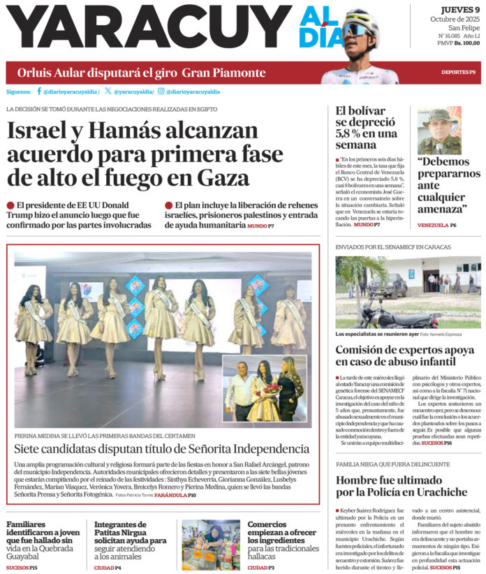 InicioPortadaPortada 9 de octubre Portada Portada 9 de octubre Por Redacción 9 de octubre de 2025 Compartir FacebookTwitterWhatsApp - Publicidad - Compartir FacebookTwitterWhatsApp Artículo anteriorJosé Guerra: No hay salario que aguante este ritmo de devaluaciónArtículo siguienteSe comienza a ver la cara en el mercado de los ingredientes para las hallacas ARTÍCULOS RELACIONADOS Portada Portada 8 de octubre 8 de octubre de 2025 Portada Portada 7 de septiembre 7 de octubre de 2025 Portada Portada 6 de octubre 6 de octubre de 2025 Portada Portada 3 de octubre 3 de octubre de 2025 Portada Portada 2 de octubre 2 de octubre de 2025 Portada Portada 1 de octubre 1 de octubre de 2025 Últimas entradas En Táchira estudiante hirió con arma blanca a tres personas dentro de un liceo, al parecer cumplía reto viral 9 de octubre de 2025 Se comienza a ver la cara en el mercado de los ingredientes para las hallacas 9 de octubre de 2025 Maduro: Responsables de planear atentado contra embajada en Caracas están en EE UU 8 de octubre de 2025 Israel y Hamás acordaron primera fase de plan de paz, anunció Trump 8 de octubre de 2025 Cargar más lo más leído Mujer detenida en Páez hace 9 días es una de las 25 personas arrestadas por ser promotoras del dólar no oficial 31 de mayo de 2025 ¡PSG gana su primera ‘orejona’ y hace historia! Golea 5-0 al Inter 31 de mayo de 2025 Fiscales que fueron destituidos del MP entregarán escrito ante el Departamento de RR HH en Caracas 7 de julio de 2025 Alias «El Niño» fue detenido en Veroes con droga y un arma de fuego, era investigado por comisión de inteligencia de la PNB 7 de julio de 2025 Cargar más TE PUEDE INTERESAR En Táchira estudiante hirió con arma blanca a tres personas dentro de un liceo, al parecer cumplía reto viral 9 de octubre de 2025 José Guerra: No hay salario que aguante este ritmo de devaluación 8 de octubre de 2025 Maduro: Responsables de planear atentado contra embajada en Caracas están en EE UU 8 de octubre de 2025 Israel y Hamás acordaron primera fase de plan de paz, anunció Trump 8 de octubre de 2025 Cargar más