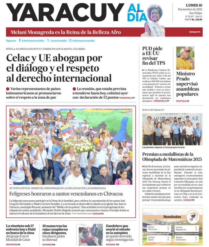 InicioSin categoríaPortada 10 de noviembre Sin categoría Portada 10 de noviembre Por Redacción 10 de noviembre de 2025 Compartir FacebookTwitterWhatsApp - Publicidad - Compartir FacebookTwitterWhatsApp Artículo anteriorPUD advierte que fin del TPS dejaría en riesgo de deportación a los venezolanos, insta a reconsiderar la decisiónArtículo siguientePremiaron más de 30 producciones en el festival de cortometrajes de la Uney ARTÍCULOS RELACIONADOS Sin categoría Sector agrícola en Venezuela ha registrado una recuperación anual del 6 % 7 de noviembre de 2025 Ciencia y Tecnología Selección venezolana de robótica ganó el FIRST Global Challenge 2025 en Panamá ¡Compitió entre 190 países! 3 de noviembre de 2025 Sin categoría Delcy Rodríguez niega acuerdos con Trump para un gobierno de transición en Venezuela 17 de octubre de 2025 Sin categoría Portada 13 de octubre 13 de octubre de 2025 Mundo Joe Biden pasa por tratamiento de radio terapia para combatir el cáncer de próstata 11 de octubre de 2025 Sin categoría Despliegan operativo de seguridad en Monumento Natural María Lionza 10 de octubre de 2025 Últimas entradas Premiaron más de 30 producciones en el festival de cortometrajes de la Uney 10 de noviembre de 2025 PUD advierte que fin del TPS dejaría en riesgo de deportación a los venezolanos, insta a reconsiderar la decisión 9 de noviembre de 2025 Celac y la UE piden respeto al derecho internacional en la lucha contra el narcotráfico durante cumbre en Colombia 9 de noviembre de 2025 Melani Monagreda conquistó la Gala de la Belleza Afro 9 de noviembre de 2025 Cargar más lo más leído Mujer detenida en Páez hace 9 días es una de las 25 personas arrestadas por ser promotoras del dólar no oficial 31 de mayo de 2025 ¡PSG gana su primera ‘orejona’ y hace historia! Golea 5-0 al Inter 31 de mayo de 2025 Fiscales que fueron destituidos del MP entregarán escrito ante el Departamento de RR HH en Caracas 7 de julio de 2025 Alias «El Niño» fue detenido en Veroes con droga y un arma de fuego, era investigado por comisión de inteligencia de la PNB 7 de julio de 2025 Cargar más TE PUEDE INTERESAR PUD advierte que fin del TPS dejaría en riesgo de deportación a los venezolanos, insta a reconsiderar la decisión 9 de noviembre de 2025 Celac y la UE piden respeto al derecho internacional en la lucha contra el narcotráfico durante cumbre en Colombia 9 de noviembre de 2025 En asambleas comunales eligieron comités bolivarianos de Base Integral 9 de noviembre de 2025 Rodrigo Paz al jurar como Presidente: Bolivia vuelve al mundo y el mundo vuelve a Bolivia 8 de noviembre de 2025 Cargar más