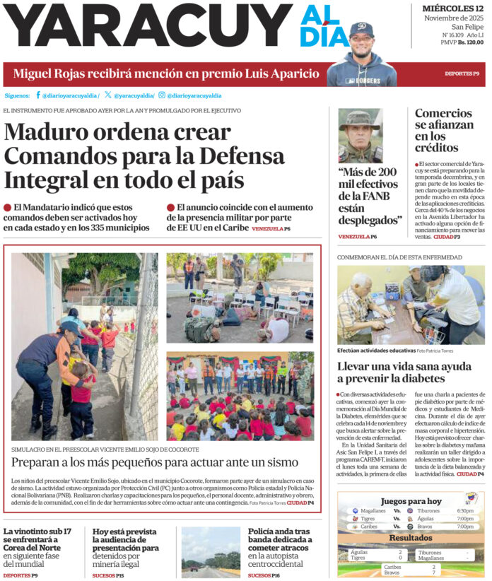 InicioPortadaPortada 12 de noviembre PortadaSin categoría Portada 12 de noviembre Por Redacción 12 de noviembre de 2025 Compartir FacebookTwitterWhatsApp - Publicidad - Compartir FacebookTwitterWhatsApp Artículo anteriorGobierno activa despliegue militar masivo ante amenaza de agresión de Estados UnidosArtículo siguienteYaracuy celebrará el Día Nacional del Teatro con una entretenida programación ARTÍCULOS RELACIONADOS Portada Portada 11 de noviembre 11 de noviembre de 2025 Portada Portada 10 de noviembre 10 de noviembre de 2025 Sin categoría Sector agrícola en Venezuela ha registrado una recuperación anual del 6 % 7 de noviembre de 2025 Portada Portada 7 de noviembre 7 de noviembre de 2025 Portada Portada 6 de noviembre 6 de noviembre de 2025 Portada Portada 5 de noviembre 5 de noviembre de 2025 Últimas entradas Yaracuy celebrará el Día Nacional del Teatro con una entretenida programación 12 de noviembre de 2025 Primero Justicia advierte que la inflación saca la proteína de la mesa venezolana 12 de noviembre de 2025 Gobierno activa despliegue militar masivo ante amenaza de agresión de Estados Unidos 11 de noviembre de 2025 Maduro ordena creación de los comandos de Defensa Integral en todo el país 11 de noviembre de 2025 Cargar más lo más leído Mujer detenida en Páez hace 9 días es una de las 25 personas arrestadas por ser promotoras del dólar no oficial 31 de mayo de 2025 ¡PSG gana su primera ‘orejona’ y hace historia! Golea 5-0 al Inter 31 de mayo de 2025 Fiscales que fueron destituidos del MP entregarán escrito ante el Departamento de RR HH en Caracas 7 de julio de 2025 Alias «El Niño» fue detenido en Veroes con droga y un arma de fuego, era investigado por comisión de inteligencia de la PNB 7 de julio de 2025 Cargar más TE PUEDE INTERESAR Primero Justicia advierte que la inflación saca la proteína de la mesa venezolana 12 de noviembre de 2025 Gobierno activa despliegue militar masivo ante amenaza de agresión de Estados Unidos 11 de noviembre de 2025 Maduro ordena creación de los comandos de Defensa Integral en todo el país 11 de noviembre de 2025 «El mercado quincenal ya no existe»: compras promedio en supermercados se sitúan entre US$8 y US$23 11 de noviembre de 2025 Cargar más