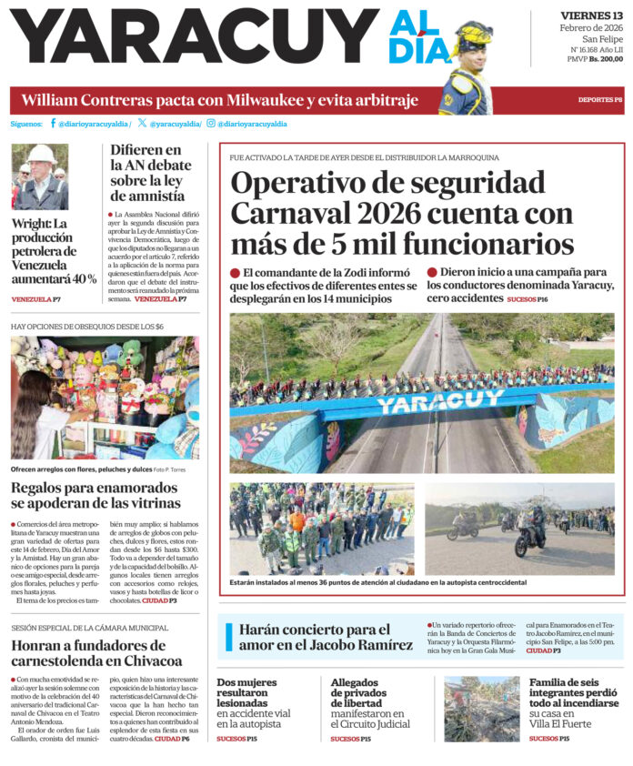 InicioSin categoríaPortada 13 de febrero Sin categoría Portada 13 de febrero Por Redacción 13 de febrero de 2026 Compartir FacebookTwitterWhatsApp - Publicidad - Compartir FacebookTwitterWhatsApp Artículo anteriorEstudiantes se movilizaron en al menos 10 estado del país por la libertad de presos por razones políticasArtículo siguienteEstablecimientos comerciales lucen sus mejores ofertas para los enamorados ARTÍCULOS RELACIONADOS Sin categoría Presentaron ante un tribunal a homicida de exfuncionaria policial (Yaracuy) 9 de febrero de 2026 Sin categoría Portada 5 de febrero 5 de febrero de 2026 Sin categoría Portada 4 de febrero 4 de febrero de 2026 Comunidad Gobernador Intoci: Despliegue de protección social nos mantiene más cerca del pueblo 1 de febrero de 2026 Opinión Humberto Peinado Vila…Enemigo al acecho 30 de enero de 2026 Sin categoría MAS propone reforma legal para salario justo y pensiones indexadas 20 de enero de 2026 Últimas entradas Establecimientos comerciales lucen sus mejores ofertas para los enamorados 13 de febrero de 2026 Estudiantes se movilizaron en al menos 10 estado del país por la libertad de presos por razones políticas 12 de febrero de 2026 Asamblea Nacional difiere discusión de ley de amnistía por discrepancias sobre personas beneficiadas 12 de febrero de 2026 Christopher Wright: Esperamos un incremento entre 30 % y 40 % en la producción petrolera venezolana 12 de febrero de 2026 Cargar más lo más leído Mujer detenida en Páez hace 9 días es una de las 25 personas arrestadas por ser promotoras del dólar no oficial 31 de mayo de 2025 ¡PSG gana su primera ‘orejona’ y hace historia! Golea 5-0 al Inter 31 de mayo de 2025 Fiscales que fueron destituidos del MP entregarán escrito ante el Departamento de RR HH en Caracas 7 de julio de 2025 Alias «El Niño» fue detenido en Veroes con droga y un arma de fuego, era investigado por comisión de inteligencia de la PNB 7 de julio de 2025 Cargar más TE PUEDE INTERESAR Estudiantes se movilizaron en al menos 10 estado del país por la libertad de presos por razones políticas 12 de febrero de 2026 Asamblea Nacional difiere discusión de ley de amnistía por discrepancias sobre personas beneficiadas 12 de febrero de 2026 Christopher Wright: Esperamos un incremento entre 30 % y 40 % en la producción petrolera venezolana 12 de febrero de 2026 Fallece mujer en Puerto Ordaz tras dar a luz a trillizos, uno de los bebés murió a las horas 12 de febrero de 2026 Cargar más