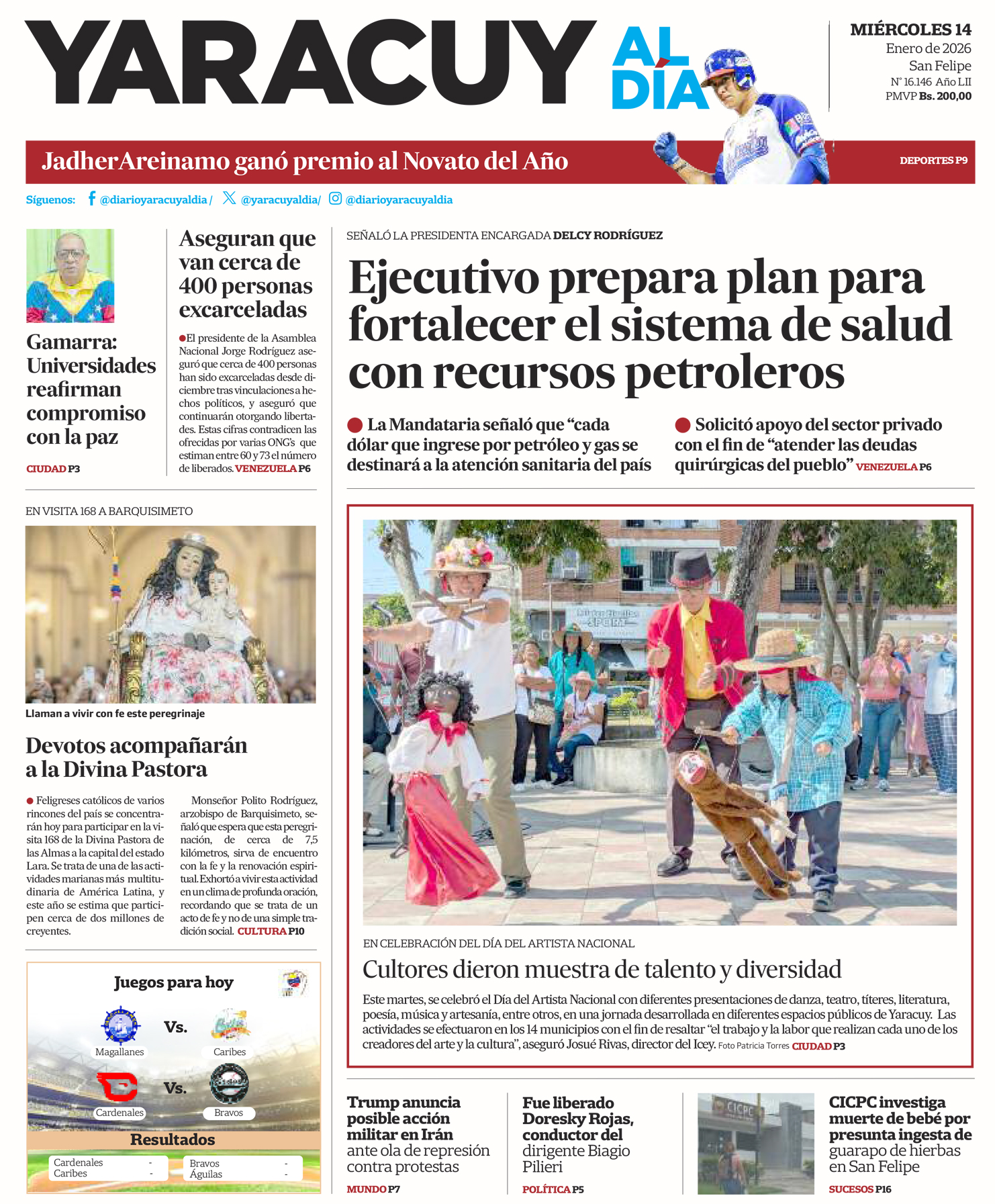 InicioSin categoríaPortada 14 de enero Sin categoría Portada 14 de enero Por Redacción 14 de enero de 2026 Compartir FacebookTwitterWhatsApp - Publicidad - Compartir FacebookTwitterWhatsApp Artículo anteriorJorge Rodríguez confirma excarcelación de cerca de 400 personas desde diciembreArtículo siguienteMiguel Ugas: Es momento de la unidad nacional en defensa del poder adquisitivo y recuperación de los servicios públicos ARTÍCULOS RELACIONADOS Deportes Silvino, Hernán Pérez, Balbino y Reyes son los primeros premiados de la LVBP 13 de enero de 2026 Sin categoría Autoridades inauguran puente de hierro en San Javier que asegura conectividad a más de 20.000 habitantes 9 de enero de 2026 Mundo Trump concede entrevista a Fox News: Maduro y su esposa están en un buque, serán trasladados a Nueva York 3 de enero de 2026 Portada Portada 23 de diciembre 23 de diciembre de 2025 Opinión Humberto Peinado Vila…Crece, crece la audiencia 8 de diciembre de 2025 Sin categoría Policía regional realizó operativo relámpago en Manuel Monge (Yaracuy) 26 de noviembre de 2025 Últimas entradas Movimiento por la paz prepara agenda en defensa de la soberanía 14 de enero de 2026 Expresidente de Fedecámaras pide rescatar la soberanía y el diálogo entre actores políticos del país 14 de enero de 2026 Vladimir Padrino López: Venezuela tiene que continuar su camino 14 de enero de 2026 Miguel Ugas: Es momento de la unidad nacional en defensa del poder adquisitivo y recuperación de los servicios públicos 14 de enero de 2026 Cargar más lo más leído Mujer detenida en Páez hace 9 días es una de las 25 personas arrestadas por ser promotoras del dólar no oficial 31 de mayo de 2025 ¡PSG gana su primera ‘orejona’ y hace historia! Golea 5-0 al Inter 31 de mayo de 2025 Fiscales que fueron destituidos del MP entregarán escrito ante el Departamento de RR HH en Caracas 7 de julio de 2025 Alias «El Niño» fue detenido en Veroes con droga y un arma de fuego, era investigado por comisión de inteligencia de la PNB 7 de julio de 2025 Cargar más TE PUEDE INTERESAR Expresidente de Fedecámaras pide rescatar la soberanía y el diálogo entre actores políticos del país 14 de enero de 2026 Vladimir Padrino López: Venezuela tiene que continuar su camino 14 de enero de 2026 Jorge Rodríguez confirma excarcelación de cerca de 400 personas desde diciembre 13 de enero de 2026 Delcy Rodríguez anuncia plan para fortalecer el Sistema Público de Salud 13 de enero de 2026 Cargar más