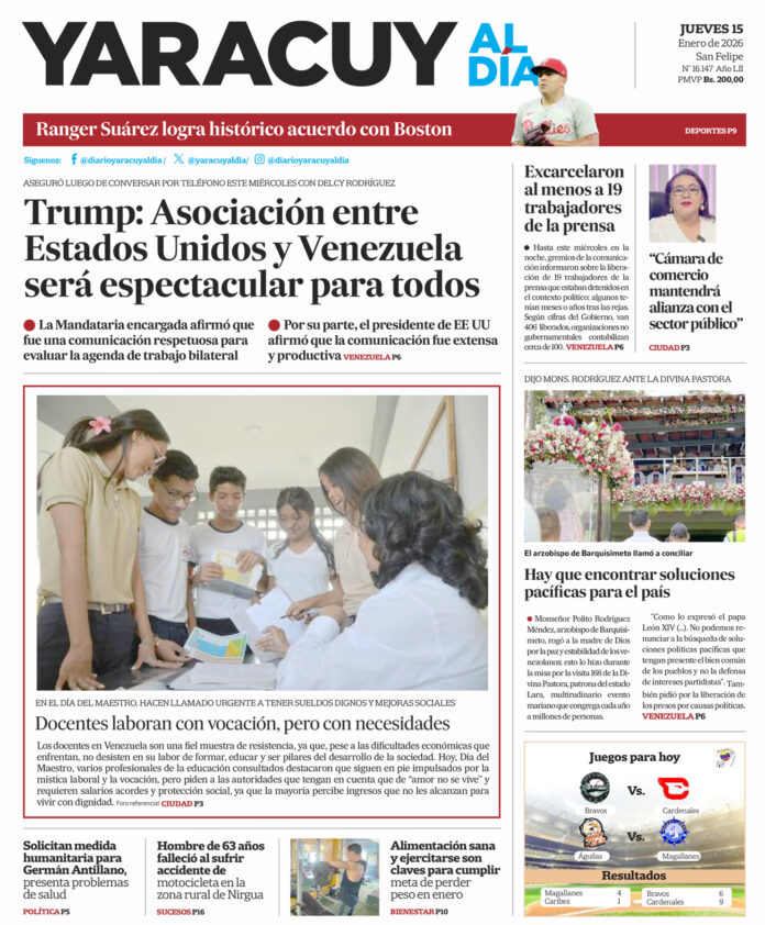 InicioSin categoríaPortada 15 de enero Sin categoría Portada 15 de enero Por Redacción 15 de enero de 2026 Compartir FacebookTwitterWhatsApp - Publicidad - Compartir FacebookTwitterWhatsApp Artículo anteriorSNTP confirma que 19 comunicadores sociales han sido excarcelados este 14 de eneroArtículo siguienteLabor docente: una vocación que resiste con el bolsillo vacío ARTÍCULOS RELACIONADOS Sin categoría Portada 14 de enero 14 de enero de 2026 Deportes Silvino, Hernán Pérez, Balbino y Reyes son los primeros premiados de la LVBP 13 de enero de 2026 Sin categoría Autoridades inauguran puente de hierro en San Javier que asegura conectividad a más de 20.000 habitantes 9 de enero de 2026 Mundo Trump concede entrevista a Fox News: Maduro y su esposa están en un buque, serán trasladados a Nueva York 3 de enero de 2026 Portada Portada 23 de diciembre 23 de diciembre de 2025 Opinión Humberto Peinado Vila…Crece, crece la audiencia 8 de diciembre de 2025 Últimas entradas Labor docente: una vocación que resiste con el bolsillo vacío 15 de enero de 2026 SNTP confirma que 19 comunicadores sociales han sido excarcelados este 14 de enero 14 de enero de 2026 Venezuela consolida liderazgo cacaotero con crecimiento exponencial de 111 % en exportación 14 de enero de 2026 Delcy Rodríguez informó que abordó vía telefónica con Trump una agenda de trabajo bilateral en beneficio del pueblo venezolano 14 de enero de 2026 Cargar más lo más leído Mujer detenida en Páez hace 9 días es una de las 25 personas arrestadas por ser promotoras del dólar no oficial 31 de mayo de 2025 ¡PSG gana su primera ‘orejona’ y hace historia! Golea 5-0 al Inter 31 de mayo de 2025 Fiscales que fueron destituidos del MP entregarán escrito ante el Departamento de RR HH en Caracas 7 de julio de 2025 Alias «El Niño» fue detenido en Veroes con droga y un arma de fuego, era investigado por comisión de inteligencia de la PNB 7 de julio de 2025 Cargar más TE PUEDE INTERESAR SNTP confirma que 19 comunicadores sociales han sido excarcelados este 14 de enero 14 de enero de 2026 Venezuela consolida liderazgo cacaotero con crecimiento exponencial de 111 % en exportación 14 de enero de 2026 Delcy Rodríguez informó que abordó vía telefónica con Trump una agenda de trabajo bilateral en beneficio del pueblo venezolano 14 de enero de 2026 Equipos de Sevilla muestran interés por Telasco Segovia y Luis Cásseres 14 de enero de 2026 Cargar más
