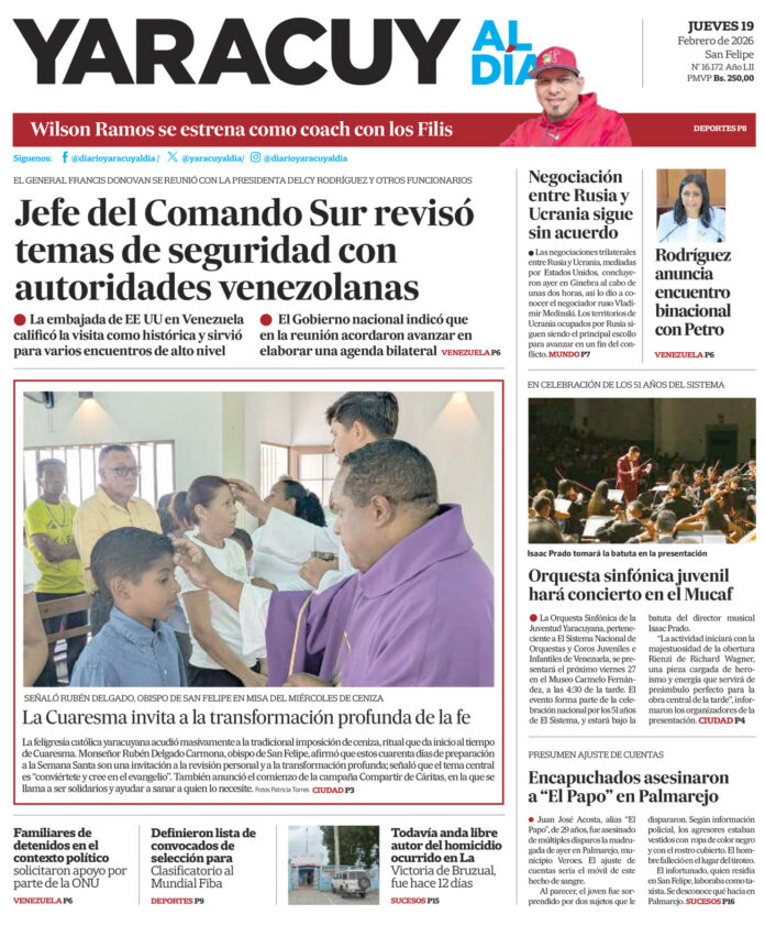 InicioSin categoríaPortada 19 de febrero Sin categoría Portada 19 de febrero Por Redacción 19 de febrero de 2026 Compartir FacebookTwitterWhatsApp - Publicidad - Compartir FacebookTwitterWhatsApp Artículo anteriorVenezuela y EE UU acuerdan diseñar agenda para lucha contra el narcotráfico durante visita del jefe del Comando SurArtículo siguienteFamiliares y activistas instan al secretario general de la ONU a pronunciarse sobre las excarcelaciones de presos por razones políticas ARTÍCULOS RELACIONADOS Sin categoría Marco Rubio lanza mensaje de unidad entre EE UU y Europa 14 de febrero de 2026 Sin categoría Portada 13 de febrero 13 de febrero de 2026 Sin categoría Presentaron ante un tribunal a homicida de exfuncionaria policial (Yaracuy) 9 de febrero de 2026 Sin categoría Portada 5 de febrero 5 de febrero de 2026 Sin categoría Portada 4 de febrero 4 de febrero de 2026 Comunidad Gobernador Intoci: Despliegue de protección social nos mantiene más cerca del pueblo 1 de febrero de 2026 Últimas entradas Familiares y activistas instan al secretario general de la ONU a pronunciarse sobre las excarcelaciones de presos por razones políticas 19 de febrero de 2026 Venezuela y EE UU acuerdan diseñar agenda para lucha contra el narcotráfico durante visita del jefe del Comando Sur 18 de febrero de 2026 Delcy Rodríguez anuncia reunión con Gustavo Petro para blindar ejes energéticos y de seguridad 18 de febrero de 2026 Orquesta Sinfónica Yaracuyana celebrará el aniversario de El Sistema con un concierto el viernes 27Feb 18 de febrero de 2026 Cargar más lo más leído Mujer detenida en Páez hace 9 días es una de las 25 personas arrestadas por ser promotoras del dólar no oficial 31 de mayo de 2025 ¡PSG gana su primera ‘orejona’ y hace historia! Golea 5-0 al Inter 31 de mayo de 2025 Fiscales que fueron destituidos del MP entregarán escrito ante el Departamento de RR HH en Caracas 7 de julio de 2025 Alias «El Niño» fue detenido en Veroes con droga y un arma de fuego, era investigado por comisión de inteligencia de la PNB 7 de julio de 2025 Cargar más TE PUEDE INTERESAR Familiares y activistas instan al secretario general de la ONU a pronunciarse sobre las excarcelaciones de presos por razones políticas 19 de febrero de 2026 Venezuela y EE UU acuerdan diseñar agenda para lucha contra el narcotráfico durante visita del jefe del Comando Sur 18 de febrero de 2026 Delcy Rodríguez anuncia reunión con Gustavo Petro para blindar ejes energéticos y de seguridad 18 de febrero de 2026 Un bebé murió intoxicado por remedio casero en Lara 18 de febrero de 2026 Cargar más