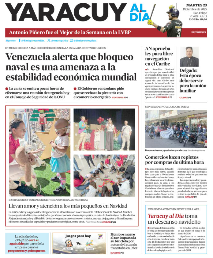 InicioPortadaPortada 23 de diciembre PortadaSin categoría Portada 23 de diciembre Por Redacción 23 de diciembre de 2025 Compartir FacebookTwitterWhatsApp - Publicidad - Compartir FacebookTwitterWhatsApp Artículo anteriorAN aprobó proyecto de ley para la libre navegación y comercio en el mar CaribeArtículo siguienteFedeagro: La falta de financiamiento sigue siendo un techo para el desarrollo agrícola nacional ARTÍCULOS RELACIONADOS Portada Portada 22 de diciembre 22 de diciembre de 2025 Portada Portada 19 de diciembre 19 de diciembre de 2025 Portada Portada 18 de diciembre 18 de diciembre de 2025 Portada Portada 17 de diciembre 17 de diciembre de 2025 Portada Portada 16 de diciembre 16 de diciembre de 2025 Portada Portada 15 de diciembre 15 de diciembre de 2025 Últimas entradas Monseñor Rubén Delgado: Que Jesús nazca en cada familia de Yaracuy 23 de diciembre de 2025 Fedeagro: La falta de financiamiento sigue siendo un techo para el desarrollo agrícola nacional 23 de diciembre de 2025 AN aprobó proyecto de ley para la libre navegación y comercio en el mar Caribe 22 de diciembre de 2025 Vecinos de Cocorotico en San Felipe piden rehabilitación de la capilla 22 de diciembre de 2025 Cargar más lo más leído Mujer detenida en Páez hace 9 días es una de las 25 personas arrestadas por ser promotoras del dólar no oficial 31 de mayo de 2025 ¡PSG gana su primera ‘orejona’ y hace historia! Golea 5-0 al Inter 31 de mayo de 2025 Fiscales que fueron destituidos del MP entregarán escrito ante el Departamento de RR HH en Caracas 7 de julio de 2025 Alias «El Niño» fue detenido en Veroes con droga y un arma de fuego, era investigado por comisión de inteligencia de la PNB 7 de julio de 2025 Cargar más TE PUEDE INTERESAR Fedeagro: La falta de financiamiento sigue siendo un techo para el desarrollo agrícola nacional 23 de diciembre de 2025 AN aprobó proyecto de ley para la libre navegación y comercio en el mar Caribe 22 de diciembre de 2025 Alerta Maduro: Acciones de Estados Unidos comprometen la estabilidad económica mundial 22 de diciembre de 2025 Cardenales se convirtió en el segundo clasificado al Round Robin y Leones evita la eliminación 22 de diciembre de 2025 Cargar más