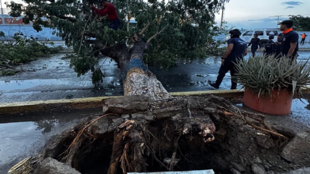 Tras los fuertes vientos que también se registraron durante las lluvias, un árbol se vino abajo en la avenida Independencia, lo que limitó por unos minutos el tránsito vehicular por esa arteria vial, hasta que fue removido por funcionarios de Protección Civil.