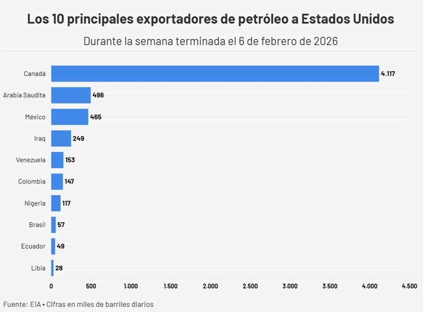 Con la cifra de los primeros siete días de febrero, Venezuela subió del octavo al quinto lugar en el top 10 de los principales proveedores de crudo a las refinerías estadounidenses, el lugar más alto desde la penúltima semana de diciembre.