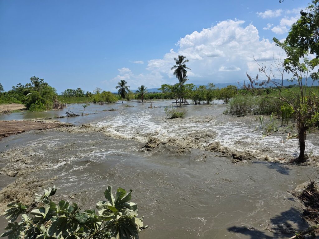 Dirigentes sociales de la zona informaron que desde el sábado que comenzó a crecer el río se percataron de que el terraplén comenzó a filtrarse, y en la madrugada de este lunes prácticamente se reventó y así se inundaron por lo menos 100 hectáreas que estaban sembradas de plátano, yuca y lechosa.