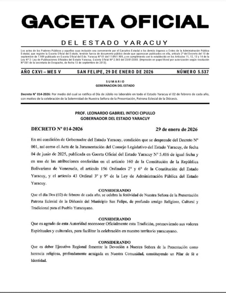 Este viernes 30 de enero, el gobernador de Yaracuy Leonardo Intoci, en Gaceta Oficial Nro. 5.537, ratifica el 2 de febrero como Día de Júbilo no laborable en todo el estado Yaracuy, esto por la celebración de la Solemnidad en honor a Nuestra Señora de la Presentación, patrona eclesial de la Diócesis de San Felipe.